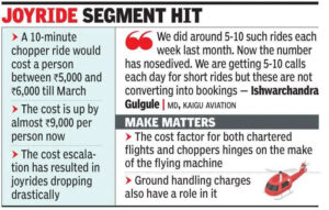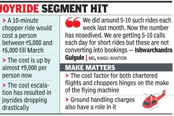 Pune:A cool chopper ride to Mumbai or a dash to Delhi on a chartered flight has become dearer by 30-40% in April — T S Eliot’s “the cruellest month”.Reason: The West Asia conflict-induced price hike of aviation turbine fuel (ATF). End-result: Decline in customer base of operators.Ishwarchandra Gulgule, the managing director of Kaigu Aviation, toldTOI,…