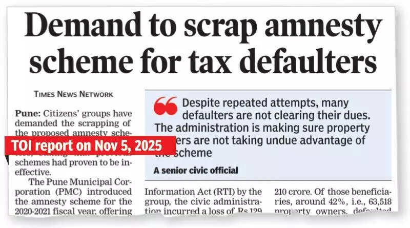 Pune: The civic body has decided to ban owners of 1.38 lakh properties who are repeat defaulters from availing the property tax amnesty scheme.Pune Municipal Corporation (PMC) took the decision after citizens’ groups raised objections that some property owners were defaulting on their taxes each year and taking undue advantage of the amnesty scheme.Under this scheme, the administration offered a 75% discount on the penalty for the pending property tax.“Steps are being taken to ensure that only genuine beneficiaries receive the benefits of the schemes. Repeated benefits will not be allowed for property owners. All those who have already participated in the scheme will not be allowed to take part again,” said Ravi Pawar, head of PMC’s property tax department.“Multiple amnesty schemes are not good for the financial discipline of the municipal corporation. It sends a wrong message to the diligent taxpayers,” said Vivek Velankar of Sajag Nagrik Manch, a citizens’ group that raised objections to the announcement of the scheme.PMC data shows that tax, including dues of around Rs 13,097.11 crore, is to be recovered from defaulters. It includes Rs 3,635.62 crore original tax and Rs 9,461.49 crore penalty. The civic administration declared an amnesty scheme for property tax defaulters last week, which will be implemented from Nov 15.“Since the 2% compound interest-like penalty amount levied monthly has exceeded the original tax amount, an amnesty scheme is being implemented from Nov 15, 2025 to Jan 15 next year. It will offer a 75% waiver on the penalty amount,” the administration stated in its proposal.As per Maharashtra Municipal Corporation Act, provisions have been made to levy a 2% monthly penalty after the stipulated deadline if property tax is not paid on time. As per the proposal of the scheme, the property tax arrears, including a 2% monthly penalty on defaulting properties, are substantially high.