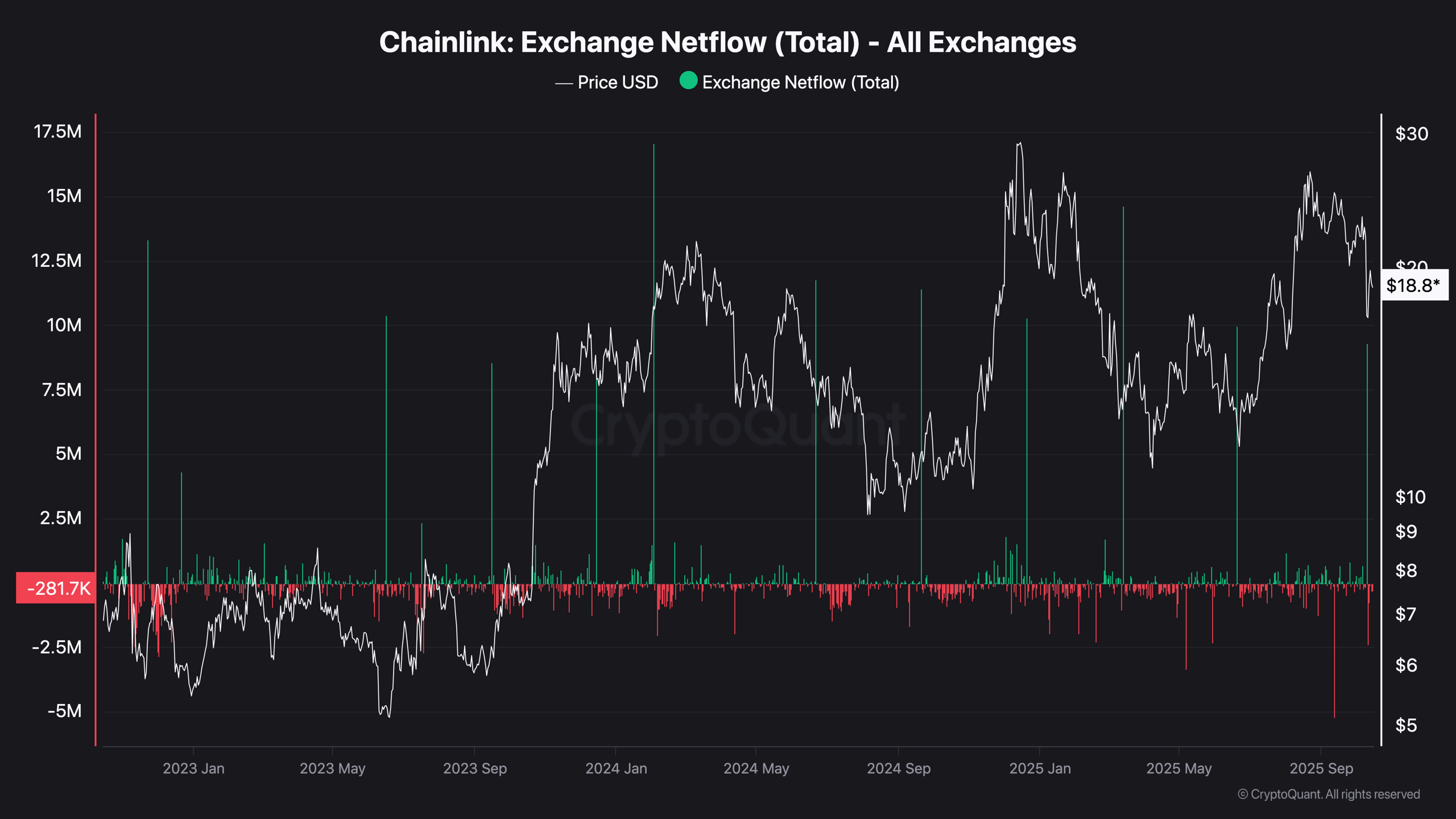 Additionally, data from CryptoQuant shows a net outflow of 281,700 LINK from exchanges in the recent period. This means more LINK was moved out of trading platforms than brought in. The timing aligns with the drop in price, suggesting the withdrawals are not related to selling pressure.
