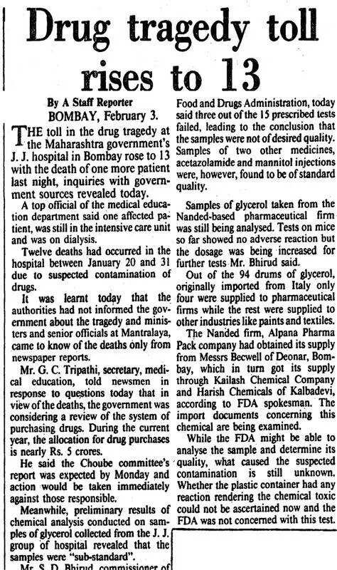 In a grim replay of history, the recent deaths of several children in Madhya Pradesh after consuming contaminated cough syrup have revived memories of Mumbai’s J J Hospital tragedy of 1986, when 14 patients—including a 10-year-old child—died of acute renal failure after being administered glycerol syrup laced with diethylene glycol (DEG).Then, as now, the culprit was a toxic chemical masquerading as a pharmaceutical ingredient. At the time, Justice B S Lentin’s commission had found that the glycerol used at J J Hospital had 90% DEG — sourced from a small-time Nanded-based repackaging unit Alpana Pharma, which had sourced it from an industrial supplier instead of a pharmaceutical-grade manufacturer.“The glycerol used at J J Hospital came from an industrial supplier with no pharmaceutical clearance,” said Dr Ishwar Gilada, who was serving as resident medical officer at J J Hospital that year. “It was a lethal oversight,” said Dr Gilada, recalling that Justice Lentin had described the J J Hospital case as “a tragic monument to neglect.”Today, nearly four decades later, a similar pattern seems to be unfolding in MP. In Chhindwara district, at least 14 children have died after consuming Coldrif cough syrup. Tests by Tamil Nadu drug control authorities found it contained 48.6% DEG, a deadly solvent that attacks the kidneys. The state govt has banned the syrup, announced Rs 4 lakh compensation per victim, and launched a probe into the manufacturer, Sresan Pharmaceuticals.“The syrup should be banned across the nation, not just in a few states,” said Dr Gilada, who believes India has yet to learn from the four-decade-old tragedy whose memories are still fresh in his mind. “I was in the casualty department when I first got a call about a patient falling unconscious in the ophthalmology section. The call was then sent to the neurology section,” recalled Dr Gilada, about a pattern that repeated across patients in Jan 1986. Victims who died between Jan and Feb that year included Tanveer Baig (10) and others between the ages of 20 and 60.A 1987 TOI report detailed how glycerol—which was administered to patients from the neurosurgery and ophthalmology sections of J J Hospital in Jan 1986—continued to be administered in the hospitals ophthalmology department even three days after a circular ordered it stopped. This led patients such as Abdul Kadar Sheikh, who was admitted with a “cataract with a simple glaucoma”, and Bittal Kewat to develop anuria (sharply reduced urine output) before dying of renal failure.Autopsy reports of the 13 victims showed that “something had hit them like a bullet,” said Dr U L Wagholikar, head of J J’s pathology department, in his statement to the commission. An inquiry revealed that the adulterated glycerol had been purchased from an industrial supplier marketing its product as “IP”—Industrial Pure—not Indian Pharmacopoeia, which is meant for human consumption.The 289-page report submitted in Nov 1987 exposed the nexus between the ‘apathetic’ administrators of the hospital and the ‘corrupt’ officials from the FDA and the state health department, whose collective failure to ensure drug safety led to the deaths. The report recommended two deans for an institution of JJ Hospital’s size—one for administration and the other for medical affairs. While the administrative post was created, it had been vacant for six years until 2022, said a TOI report that appeared in the wake of deaths of 69 children in Gambia due to cough syrup contamination linked toIndian manufacturers.On Monday, police exhumed the body of a two-year-old in MP’s Chhindwara for autopsy. “Each child’s death should trigger police investigations, FIRs, and postmortems with chemical analysis of the kidneys, liver, brain, pancreas, and lungs to detect DEG or ethylene glycol,” said Dr Gilada, emphasising the importance of tracing the source of the glycerol used in the syrups. Even as the Central Drugs Standard Control Organisation (CDSCO) has begun risk-based inspections of manufacturing units across six states, including MP and TN, experts warn that India’s fragmented oversight leaves room for repeated lapses. Some govt lab reports have shown no contamination, while others detected DEG levels far above safety limits — a gap that underscores the need for coordinated, transparent testing. “Samples from every suspect cough syrup batch must be tested across multiple labs — the CDSCO Lab, state forensic labs, the Indian Pharmacopoeia Laboratory, and at least one independent private lab,” said Dr Gilada.Among other reforms, Justice Lentin’s report had called for an ‘assertive commissioner of proven administrative ability’ to ensure stringent implementation of the Drugs and Cosmetics Act. “We must separate food administration from drug administration,” believes Dr Gilada. “Food and medicine are not the same.” While Justice Lentin’s report led to major reforms in drug procurement and testing, those lessons—he said—were never fully implemented. “We must study, analyse and implement the findings of that report,” said Dr Gilada. “Those were written in blood.”