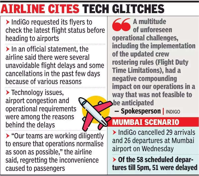 Baner’s Sanjay Ghorpade, booked on IndiGo’s Nagpur-Pune flight on Tuesday night, said it was supposed to take off at 11.40pm and land in the city at 1am. “We were informed during the check-in that the flight would depart at 12.25am. During the security check, we were told it would fly at 12.40am. The airline’s ground staffers put about half of the 150 passengers in a bus around 12.20am and it drove towards the aircraft. When we got into another bus, we were told that the pilots’ duty hours were over and there would be further delay. We remained in the bus from 12.30am to 1.40am without any information,” he said.When Ghorpade protested, the bus finally moved. “It dropped us at the arrival area and disappeared. When we went for check-in again, the CISF stopped us, saying we cannot do it again. As we moved around cluelessly, we were told around 2.15am that the flight was cancelled. I, along with my three friends, had to book a cab to Pune. It cost us a total of Rs30,000. The airline said we could fly only after two days,” he said.An IndiGo spokesperson said, “We acknowledge that IndiGo’s operations have been significantly disrupted across the network for the past two days and we sincerely apologise to our customers for the inconvenience caused. A multitude of unforeseen operational challenges, including the implementation of the updated crew rostering rules (Flight Duty Time Limitations), had a negative compounding impact on our operations in a way that was not feasible to be anticipated.“He said, “To contain the disruption and restore stability, we have initiated calibrated adjustments to our schedules. These measures will remain in place for the next 48 hours to allow us to normalise our operations and progressively recover our punctuality across the network. Our teams are working around the clock to ease customer discomfort and ensure operations stabilise as quickly as possible. The affected customers are being offered alternate travel arrangements to reach their destinations or refunds, as applicable.“Passengers were livid. Raviraj Kajave, travelling from Pune to Bengaluru on an IndiGo flight on Wednesday, wrote on X, “The scheduled departure time was 5.55am, which was changed to 7.20am. We boarded and kept waiting inside the aircraft until 9.30am. Thereafter, the cabin crew said that the flight was cancelled.”A Delhi-bound IndiGo passenger said the flight’s scheduled take off time was 7.35am. “It would have landed in Delhi by 9.35am. I waited for a long time, after which I cancelled my travel plan. The ground staff kept me saying there was a technical problem,” the flyer said.According to Flightradar24, the flight took off at 12.27pm, almost five hours after its scheduled departure time.Bhavesh Pradhan, a frequent flyer, said, “Airlines feel giving proper reasons is not binding on them. What does one mean by operational or technical reasons? Since last week, this airline has been facing issues, and we have been getting distressed.”