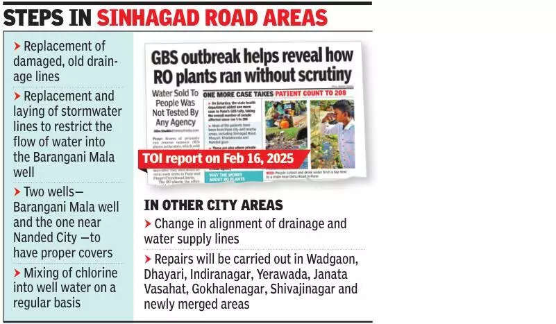 The civic administration, following the outbreak, implemented certain preventive steps, including the installation of a chlorination unit in the well to ensure adequate chlorine levels in the water. However, local residents demanded additional measures to prevent drainage or stormwater from entering the well.Residents have expressed concerns about leaking sewer lines, considering the weak drainage infrastructure in the area. They have urged the authorities to complete repairs and replacements before the onset of the monsoon.PMC officials stated that while immediate repairs were carried out earlier, further work is now being proposed. A detailed survey of drainage lines was conducted, based on which plans have been drawn up to repair or replace old and damaged lines.In addition to the Barangani Mala well, PMC is also using another well in the Nanded City area to supply water to nearby localities. As part of safety measures, there are plans to install protective covers over both wells.Similar drainage repair works are also planned in other recently merged areas of the city.A senior PMC official said, ” A fund of Rs 20 crore was sanctioned in the recent Standing Committee meeting for drainage line repairs. It was observed that drainage lines are located close to water supply pipelines, increasing the risk of contamination. The administration receives complaints from residents regarding foul-smelling or discoloured water frequently, and the proposed repairs are expected to help address these issues.“