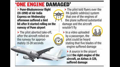 Pune: Around 140 passengers of an Air India Express’ Pune-Bhubaneswar flight (IX-1098) on Wednesday afternoon had a close shave as the aircraft aborted take-off because of a bird hit after it started rolling on the runway.Mohammad Nadeem, the passenger on seat number 22D of the plane, told TOI, “Flames started coming out of the engine after it gained speed. Right after that, the pilot hit the brakes and the aircraft came to a screeching halt. The brakes were hit so hard that some passengers’ cellphones were thrown off and a child almost fell from a woman’s arms.”He said the aircraft rolled on the runway for approximately 15-20 seconds before coming to a screeching halt. The runway length of the Pune airport is 2,535 metres (8,316 feet). Aviation experts told TOI that the average peak speed of aircraft like Airbus A320 before the take-off is 250-300 kmph.“The speed of the aircraft is always decided by the pilot. There are three kinds of speeds — V1 (decision speed), VR (rotation speed) and V2 (take-off safety speed). V1 is the maximum speed limit at which a pilot can safely abort take-off in case of an emergency. After the V1 limit, the take-off must be continued. The speed depends on factors like weather and load factor. The safety of the runway in Pune is the sole responsibility of the Indian Air Force,” aviation expert Dhairyashil Vandekar said.Last month, a bird hit was detected on an Air India’s Delhi-Pune plane after it landed at the city airport. In June, an Air India Express flight from Bhubaneswar had to abort landing and make a go-around after its pilot spotted a dog on the runway.Nadeem, booked on the Air India’ Pune-Bhubaneswar flight, said there was no announcement for around 5-10 minutes after the plane stopped on Wednesday afternoon. “Thereafter, the pilot told flyers about the incident over the PA (public address) system. He said one of the engines suffered substantial damage and the aircraft wouldn’t fly. After some time, the plane returned to the bay. We were disembarked and taken back to the terminal building,” he said.TOI contacted the airline’s spokesperson over the phone and sent him a WhatsApp message enquiring about the incident. But a reply was awaited till going to press.A source in the airport said the right engine of the aircraft, an Airbus A-320, suffered damage. In a video uploaded by Nadeem, the pilot could be heard stating that five blades of the engine suffered damage. The pilot also said a large bird was spotted on the runway and it hit the plane’s engine.Nadeem said, “The airline said an alternative aircraft was being arranged for the flyers. I had a connecting flight to Delhi. Now, I will fly there directly from Pune around 1am on Thursday on another flight of the same airline.”