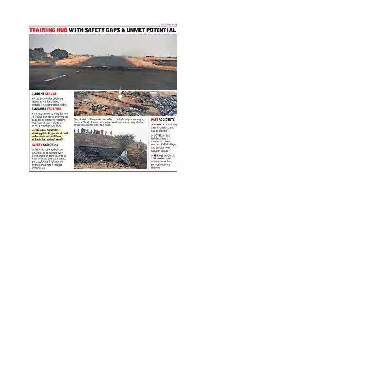 The facility was transferred to Maharashtra Airport Development Company Limited (MADC) last year on his instruction, but its impact is yet to be seen on the airfield. TOI’s multiple calls and WhatsApp messages to the MADC’s vice-chairman-cum-managing director, Swati Pandey, went unanswered.Another official said, “The GR (government resolution) to transfer the Baramati airtrip to the MADC was published only in December.” He was unable to say what kind of plans the MADC had for the facility. Maharashtra Industrial Development Corporation (MIDC) managed the airtsrip till it was transferred to the MADC. Ajit Pawar had told the MIDC to transfer the detailed project report for the Baramati facility to the MADC in October last year so that the latter could take up the project and complete the same on a priority basis. He had told the authorities to work on starting night landing facilities at different places, including Yavatmal, Dharashiv, Latur and Nanded.A source said there was no commercial flight movement in Baramati. It only recorded non-scheduled flight operations primarily because of its proximity to the Pawars’ hometown, he said. The tabletop runway of the airstrip is also used to train aspiring pilots.“In September 2021, an aircraft of Redbird Flight Training Academy — one of the two flight training organisations operating out of the facility — met with an accident at the Baramati airstrip during a solo circuit. In August last year, a trainee pilot had a close shave after an aircraft of Redbird crashed at the airport,” a source in the know of operations at the airport said.Aviation expert and CEO of Avialaz Consultants Sanjay Lazar told TOI, “Not all airports in India have ILS facilities but Baramati houses two flying academies, one of which has been there for close to 30 years. It should have had some navigational aids like ILS or ARNAV (area navigation) at least. Baramati has a 1,770-metre tabletop runway. I would not call it risky, but yes, we had accidents on other tabletop runways like Mangaluru. Tabletop runways give an optical illusion of being on the same plain as the rest of the area.”People were stopped from going to the crash site at Gojubavi village, adjacent to the Baramati airstrip, on Thursday. CID officials, along with the Pune Rural police personnel, set up a checkpoint around 1km away from the village. Even the airstrip, on a slightly elevated ground near the crash site, had police presence.The restrictions affected people living in nearby areas. Rahul Atole (41), an eyewitness to the crash, said he and his family of 16 found themselves surrounded by police presence. “The entire place has become a fortress with nobody allowed in or out. We missed Ajit Dada’s funeral because the police did not allow us to go outside our compound. We were also scared that if we left, we would not be allowed in,” he said, adding that CID officials had questioned him and other family members who saw the plane crash.