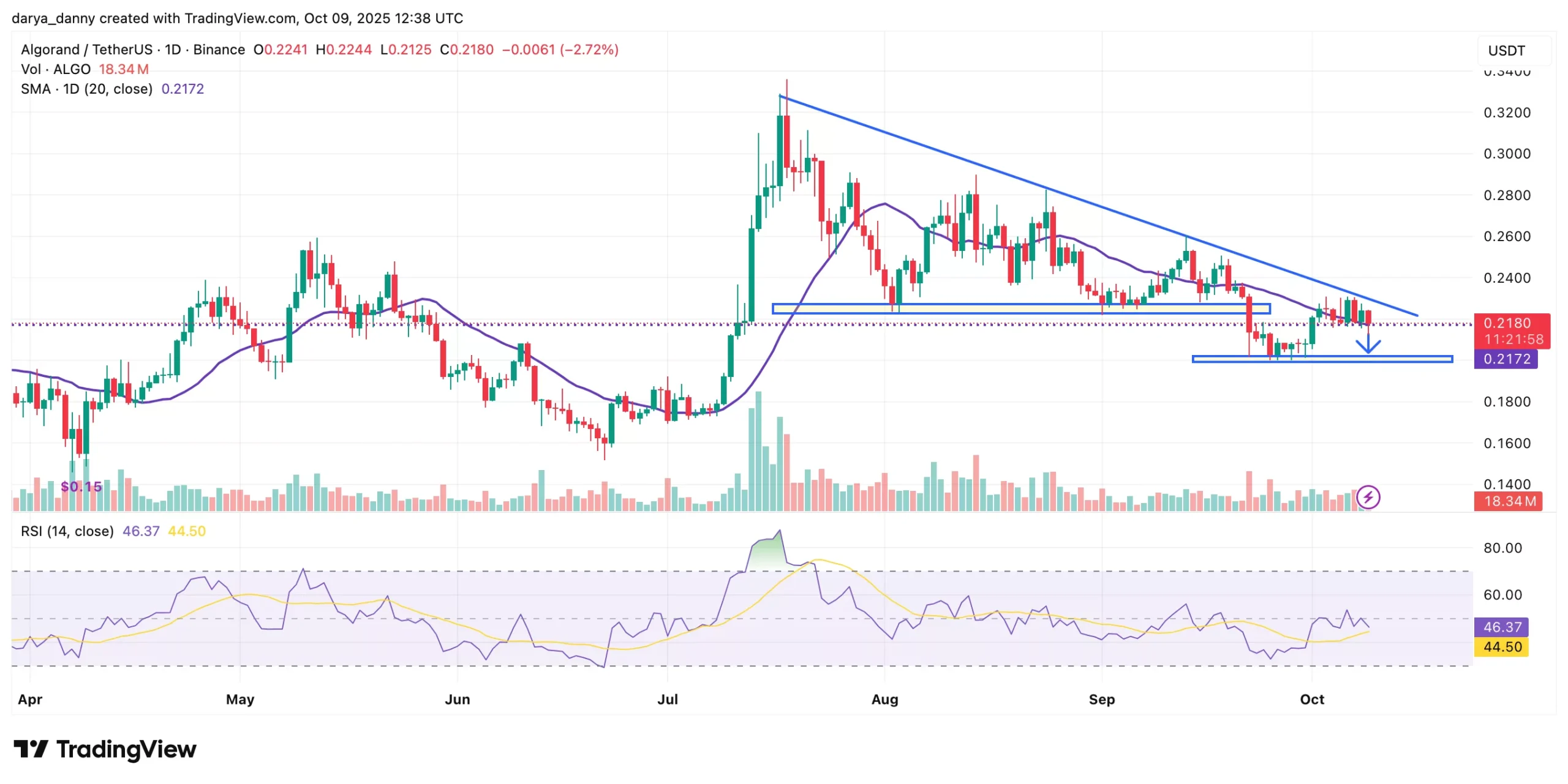 However, RSI readings hover around 46, underscoring a neutral-to-bearish bias that leaves room for further downside. Another potential retest of the $0.20 level appears likely, as that area now serves as the new local support.