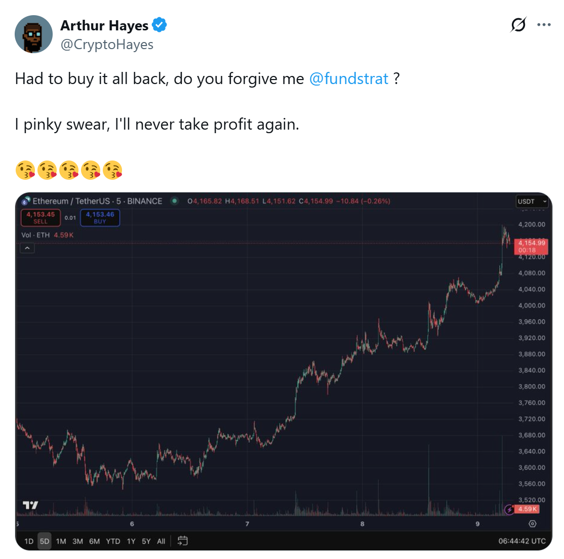 Arthur Hayes Buys Back ETH Higher, ‘Pinky Swears’ to Never Take Profit Again