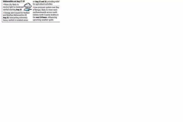 Pune: India Meteorological Department (IMD) on Thursday significantly upgraded its rainfall forecast for Maharashtra, issuing an ‘extremely heavy rainfall’ warning for Madhya Maharashtra for Aug 17-18, with the low-pressure system over Bay of Bengal continuing to influence weather. Pune city is likely to receive light to moderate rainfall starting Aug 16. IMD has also issued…