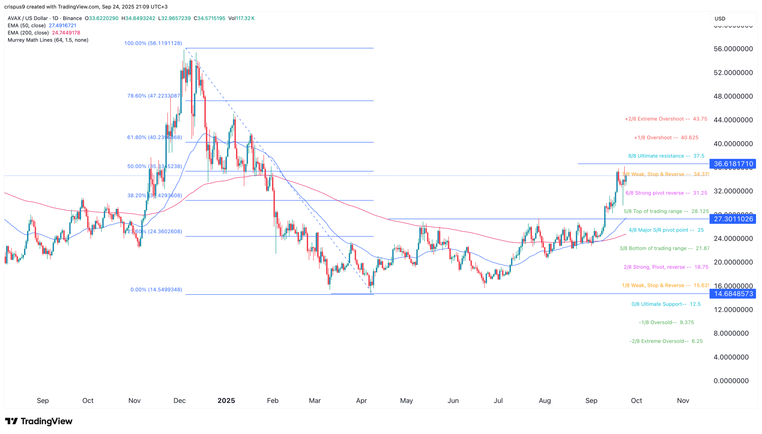 - Coupled with a bullish technical setup—including a double bottom, a golden cross, and key Fibonacci levels—Avalanche appears positioned for further upside, with $43.75 as the next potential target.