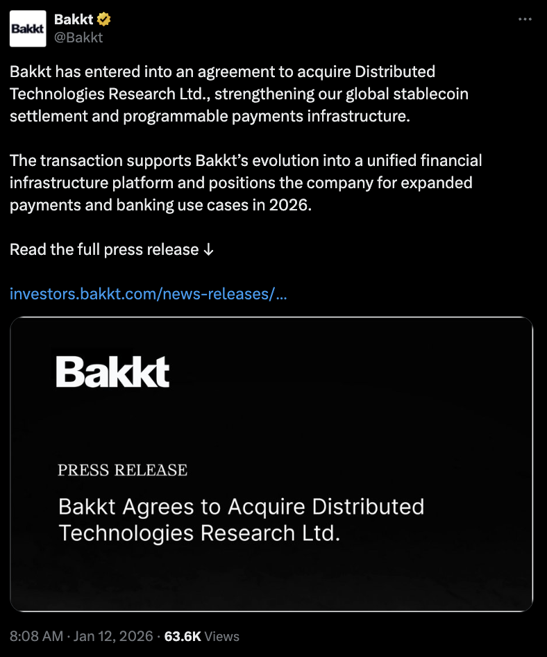 According to Bakkt, the merger was part of a strategy to form a “unified financial infrastructure platform” and expand its payment and banking use cases in 2026. The company said the deal was subject to regulatory and shareholder approval.