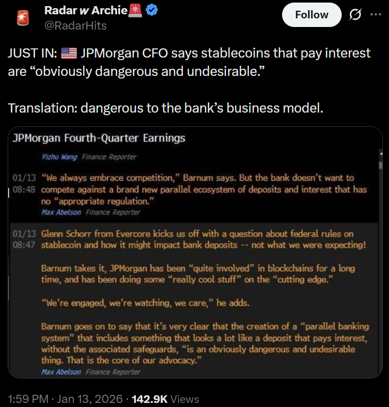 That tension is on full display this week. JPMorgan is cautioning that yield-bearing stablecoins risk recreating core banking functions without the safeguards built up over decades of regulation.
