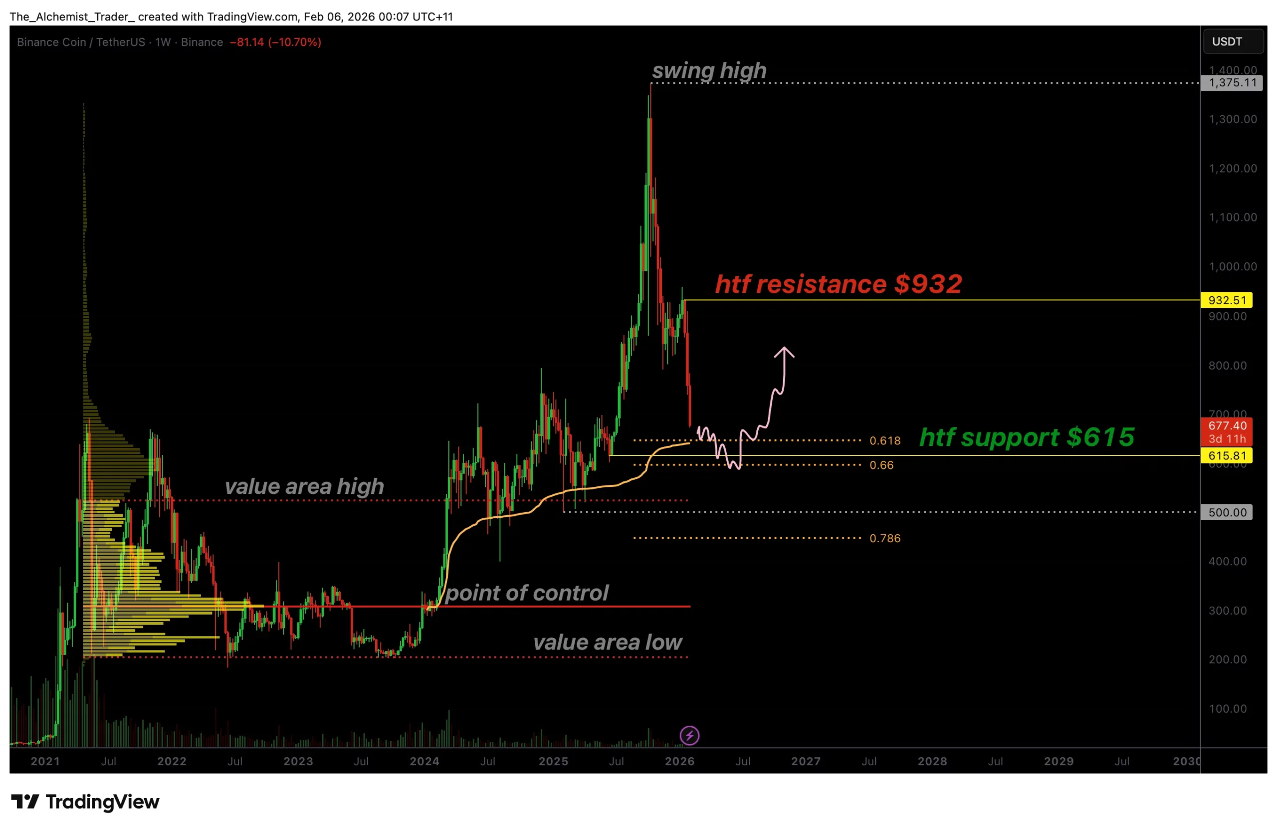As BNB continues to unwind recent gains, attention is now turning toward a key high-timeframe support region near $615, where technical confluence suggests this level may play a decisive role in determining the next directional move.