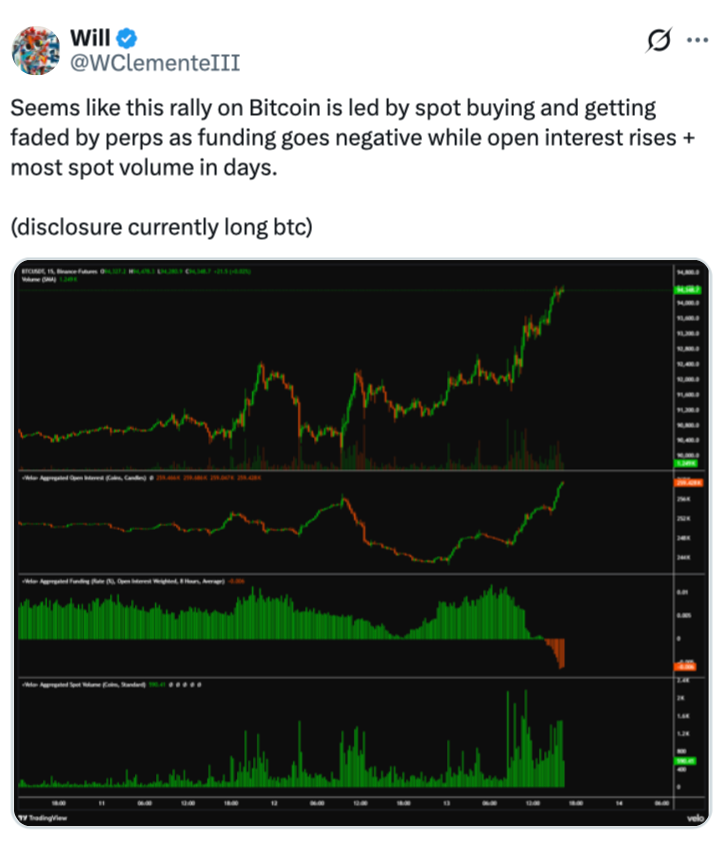 “Seems like this rally on Bitcoin is led by spot buying,” crypto analyst Will Clemente said in an X post on Tuesday. Over the past 24 hours, Bitcoin (BTC) has rallied 4.65%, trading at $95,190 at the time of publication, according to CoinMarketCap.