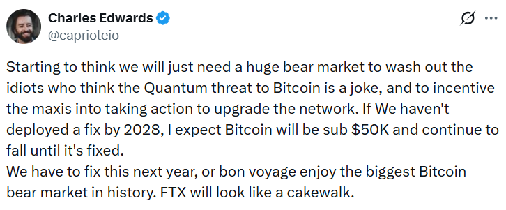 “Starting to think we will just need a huge bear market to wash out the idiots who think the Quantum threat to Bitcoin is a joke, and to incentivize the maxis into taking action to upgrade the network,” he said.