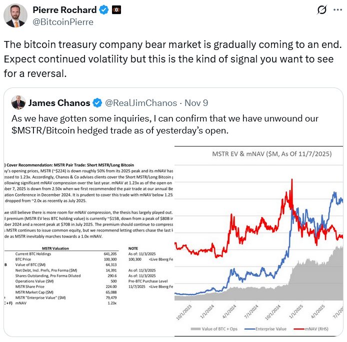 “The Bitcoin treasury company bear market is gradually coming to an end,” The Bitcoin Bond Company CEO, Pierre Rochard, said in response.