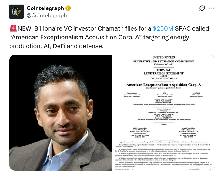 Early Bitcoin investor and billionaire Chamath Palihapitiya has filed to raise $250 million in blank-check company “American Exceptionalism Acquisition Corp A,” targeting the decentralized finance, AI, energy and defense sectors.