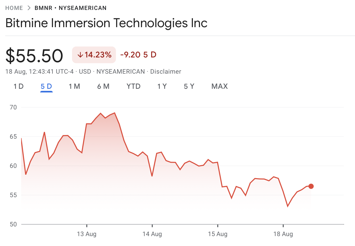 However, BitMine’s share price has suffered as the company has added more ETH to its treasury. According to Google Finance, BitMine shares have dropped 14.2% since Aug. 11, the same period during which it has bolstered its Ether holdings.