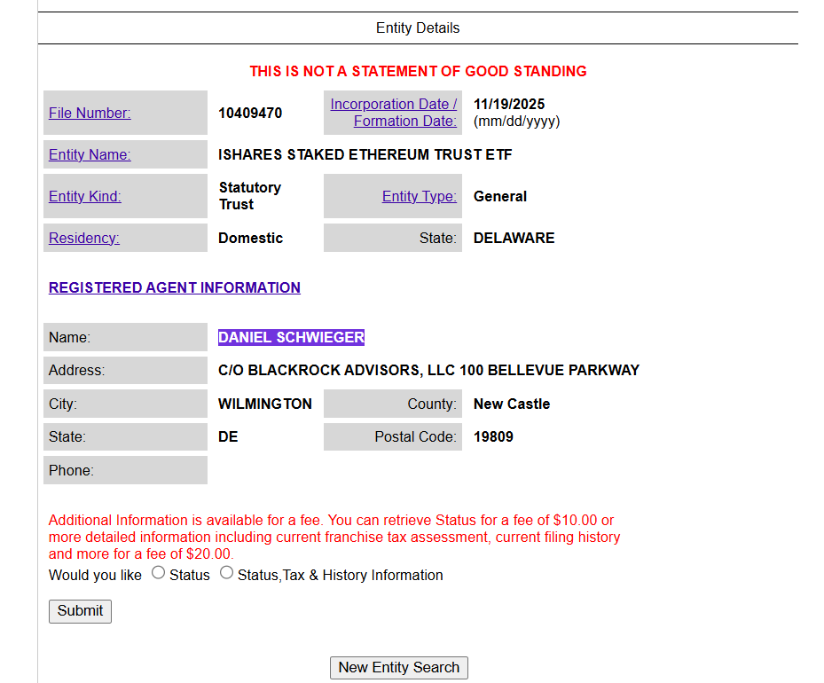 BlackRock has registered a new statutory trust in Delaware under the name iShares Staked Ethereum Trust ETF, according to records from the Delaware Division of Corporations. Delaware registrations have typically preceded formal ETF applications to the SEC in recent crypto developments.