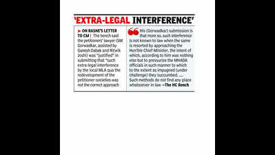 PUNE: The Bombay high court (HC) has taken an exception to the MHADA officials “overstepping their authority and jurisdiction” to misconstrue the chief minister’s (CM) remark on a letter by BJP’s Kasba Peth MLA Hemant Rasne as a stay on the redevelopment of Sunglory housing cooperative and on a redevelopment proposal of the Nutan housing cooperative, both in Sadashiv Peth.The bench of Justice Girish Kulkarni and Justice Aarti Sathe on Dec 23 also took an exception to the “extra-legal interference by the local MLA (Rasne)” with an intent of “pressurising MHADA officials” in the matter.The HC declared that MHADA’s no-objection certificate (NOC) granted to Sunglory housing cooperative on April 9, before the present row arose, is valid and legal and it can proceed with the redevelopment plan. The bench directed MHADA to decide Nutan housing cooperative’s pending proposal on or before Jan 15, 2026. MHADA officials had earlier issued communications to the effect of a “stay” despite the authority having granted an NOC to Sunglory housing cooperative and pendency of Nutan housing cooperative’s proposal. On May 14, Rasne wrote to the CM pitching for a cluster development project involving all old and dilapidated MHADA buildings in Lokmanyanagar and identifying the impending redevelopment of Sunglory and Nutan housing cooperatives as a hurdle in the same. The CM put a remark “Grant stay until further orders” and forwarded that to the vice president of MHADA, who did not record any specific instruction on the same. However, MHADA’s officiating architect and planner wrote to the chief officer on June 24 to the effect that a stay had been ordered. The chief officer later wrote to PMC citing the “stay” on NOC to Sunglory and a letter was also issued to the Nutan housing cooperative. The two societies moved the HC against these impugned (under challenge) letters.The bench noted, “We would be failing in our duty, if we do not delve on the issue leading to the MHADA officials and more particularly the Chief Officer addressing the letter to PMC (supra), as also, the In-charge Architect and Planner Mr Maheshkumar Bankar of the Pune Housing and Area Development Board addressing a letter dated 07October 2025 without verifying the correct legal position from the higher officials i.e. the Vice President, before acting upon and/or considering the implications of the remarks of the Hon’ble Chief Minister.”The bench observed that the CM’s remark was addressed to the MHADA vice-president, who had not taken any clear stand. “We have, therefore, no hesitation to deprecate such actions of these public officials when with impunity they had forgotten the statutory purport in exceeding their authority and jurisdiction when without applying their mind, such blanket actions were taken, more particularly, when a NOC was issued to Sunglory CHS and in the case of Nutan CHS, the proposal for the same was pending, such letters could not have been issued,” the bench said.