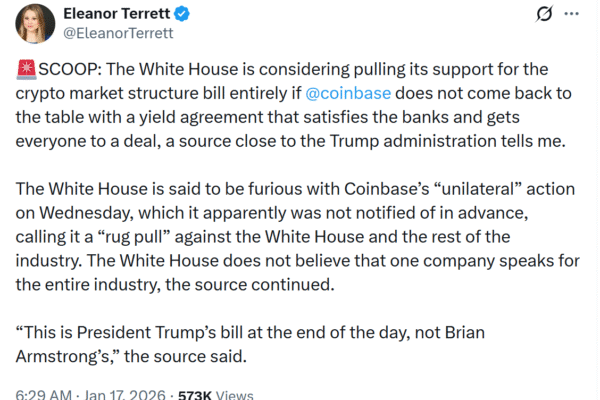 The White House is considering withdrawing its support for crypto market structure bill following a similar move from crypto exchange Coinbase, according to Fox Business reporter Eleanor Terrett, citing a source close to the Trump administration. In a Sunday post on X, Terrett reported that the White House is furious over Coinbase’s decision to pull…
