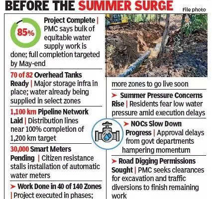 Pune: The civic body has said that nearly 85% work of the equitable water supply project in the city has been completed and the remaining would be done by May-end, even as citizens decried the delay in the deadline of Dec 2025. The Pune Municipal Corporation (PMC) said that till now, 70 of the 82…