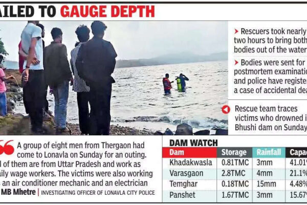 Pune: An outing in Lonavla for a group of daily wage workers from Pimpri Chinchwad turned tragic on Sunday when two of them drowned in the backwaters of Bhushi dam. Rescuers retrieved the bodies of Sahil Shaikh (18) and Mohammed Jamal (21). The youths were from Mirzapur in Uttar Pradesh, and were living in Thergaon.M…