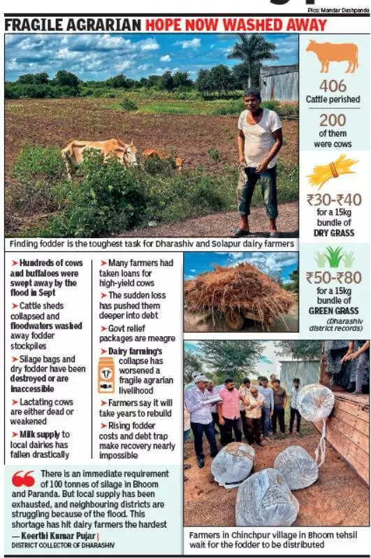 Pix by Mandar Deshpande Bhoom (Dharashiv): For Amol Dhage, a 34-year-old dairy farmer from Chinchpur village in Bhoom tehsil, the wait for the truck carrying bags of silage was endless.Every few minutes, he looked toward the road, hoping that the much-needed cattle fodder would arrive. His dairy farm, once a source of steady income, is now ruined after the devastating floods of Banganga river on the night of Sept 22.“I lost 10 of my 14 cows that night,” he said. His voice was heavy when he pointed to the collapsed cattle shed. “Along with them, the dry fodder and silage bags we had stocked were washed away. We cannot feed the surviving cows grass because everything in the village is covered in silt. We can eat clean food, how can we give mud-filled grass to the animals that were our only source of income?”Dhage planned to grow his enterprise into a 50-cow enterprise, a dream he now fears may take years to rebuild. “I will start again,” he added, “but right now I need fodder to save the few cows I have left.” He is not alone. In a neighbouring village, Sumit Joshi, a landless farmer, is struggling to keep his single surviving cow alive. “I had three cows and they were my only source of income. Two died in the flood. Now, I have only one left but there is no fodder for her. I can’t approach other farmers because they too are in the same condition,” said Joshi, showing photographs on his cellphone of his drowned cattle and wrecked shed. “I came here after hearing that govt is supplying silage. If I get a few kilos, I can feed her for a few days,” he added.Stories like these echo across Dharashiv’s Bhoom and Paranda tehsils, once hubs of small-scale dairy farming. The flood has smashed through not just homes and farms but also the very backbone of the rural economy. In the last ten days, local milk production has dropped by more than 50%, according to district officials.Current fodder rates are high. “How can we afford even ten bundles? Unless govt ensures a consistent supply for at least a fortnight, we will lose the cows that survived the flood,” a group of farmers from Madha and Karmala tehsils in neighbouring Solapur district said.Grasslands across Solapur and Dharashiv, which usually provide fodder during the kharif season, are still under water or caked in thick mud. The Sina river spread nearly 3km from its banks, submerging crops and grazing lands in more than 40 villages of Karmala and Madha.Dairy farming grew rapidly in recent years in this region and offered farmers weekly income through local dairies. That helped them cover household expenses, invest in crops, and pay for children’s education. Unlike crop earnings that come once or twice a year, milk production provided a steady cash flow.“Now that production has halved, families are left without their weekly lifeline,” agricultural activist Hemichandra Shinde said. “The collapse of dairy farming will deepen rural distress, especially because the flood has already destroyed standing crops. For many farmers, this is a double loss — their fields and their cattle are gone.”Experts and activists warn that unless fodder is supplied immediately, losses will multiply. Surviving cows, weakened by hunger and contaminated water, are vulnerable to disease. “The death of more cattle will not only ruin households but also destabilise the cooperative dairy network that sustains the region,” they said.District officials have appealed to govt for emergency fodder camps and bulk silage supply. But relief has been slow, partly because other flood-hit districts want the same scarce resource. “We are doing our best, but the demand is overwhelming,”district collector of Dharashiv Keerthi Kumar Pujar said.Farmers want the aid to go beyond just this once. “One truck of silage will not solve our problem. We need at least two weeks of steady supply until our fields dry up and we can forage for fodder. Otherwise, we will lose what little we have left,” Dhage said. For now, villagers are hopeful of govt relief and the goodwill of dairy cooperatives. Some are pooling resources to buy grass from distant markets, but transport costs make this unaffordable for most.Long-term recovery, farmers believe, will require more than fodder. “Rebuilding sheds, restocking cows, and clearing mud-covered fields will take months. But our plea is simple—first, save our cows,” Praveen Daatkhile said.Back in Chinchpur, as the truck carrying silage finally pulled into the village, a small crowd of farmers gathered, each clutching empty sacks and a desperate hope. For them, the bundles of green feed are a lifeline.Graphic :406 cattle perished200 of them were cowsDry grass I Rs 30-Rs 40, per 15-kg bundle Green grass I Rs 50 to Rs 80 (Dharashiv district records)Fragile Agrarian Hope Now Washed AwayHundreds of cows and buffaloes were swept away in Sept flood Cattle sheds collapsed and floodwaters washed away fodder stockpiles Silage bags and dry fodder have been destroyed or are inaccessibleLactating cows are either dead or weakenedMilk supply to local dairies has fallen drastically Many farmers had taken loans for high-yield cowsThe sudden loss has pushed them deeper into debtGovt relief packages are meagre Dairy farming’s collapse has worsened a fragile agrarian livelihoodFarmers say it will take years to rebuild Rising fodder costs and debt trap make recovery nearly impossibleThere is an immediate requirement of 100 tonnes of silage in Bhoom and Paranda. But local supply is exhausted, and neighbouring districts are struggling because of the flood. This shortage has hit dairy farmers the hardest Keerthi Kumar Pujar I District collector of Dharashiv