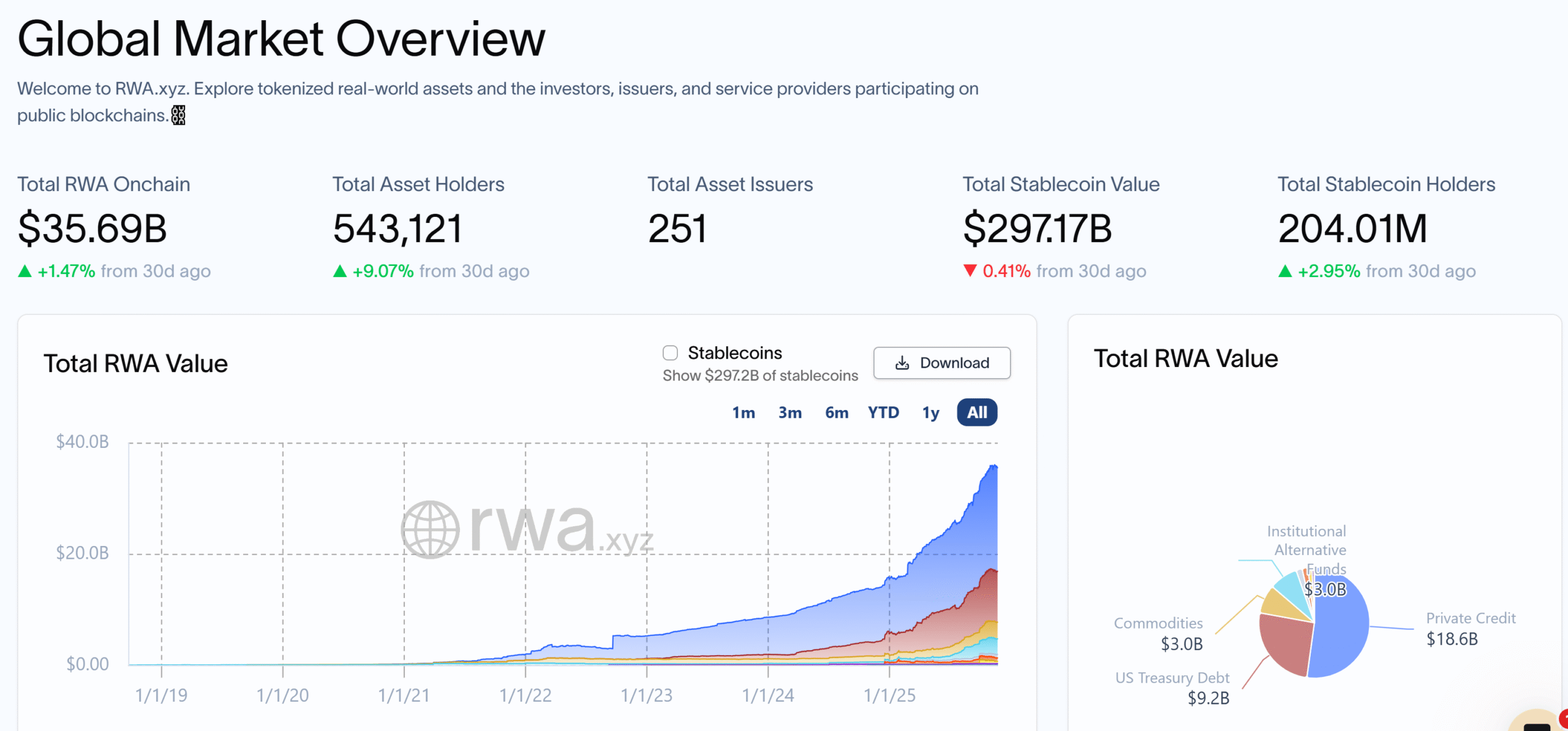The tokenized asset market has grown from $5 billion to more than $35.6 billion since early 2023, according to RWA.xyz.