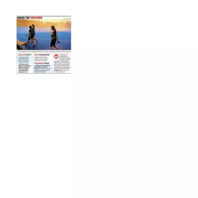 Pune: The continued drop in minimum temperature has contributing to a noticeable rise in respiratory and allergy-related illnesses, doctors told TOI on Tuesday.Dr Prakash Shende, consultant physician and professor at Dr DY Patil Medical College, said clinics were seeing a sharp rise in both infectious and non-infectious ailments since the cold set in. “Cases of common cold and lower respiratory tract infections have surged, along with non-infectious conditions. Cold weather can trigger vasospasm (temporary narrowing of blood vessels), worsening cardiac and neurological issues,” he said.Allergy-related problems have spiked too. “We’re seeing more instances of asthma, sneezing, allergic rhinitis and bronchitis. Viral pneumonia cases are rising too. Pollution and construction dust are major aggravators, and recovery times have lengthened,” Dr Shende said. “What typically resolves in four to five days is now taking 15 days to three weeks, especially cough. I am seeing 20-25 extra patients daily since temperatures began dropping,” he said.Dr Siddhant Lalwani, consultant paediatric pulmonologist, sleep and allergy specialist at Bharati Hospital and Research Centre, said children were exhibiting a similar pattern. “There is a slight surge in flu and viral upper respiratory infections. Most of my asthmatic patients are having acute flare-ups because of the cold,” he said.Health practitioners expected a further rise in acute asthma cases in the coming days. “Cold air triggers bronchospasm, and pollution is compounding the issue. With current traffic levels, Pune may slowly move in the direction of Delhi’s winter pollution pattern,” Dr Lalwani said, adding that viral infections in children were becoming more prolonged. “Fevers that earlier subsided in three to five days are now lasting six to seven days, with temperatures often rising to 103-104°F,” Dr Lalwani said.Family physician Dr Hillary Rodrigues said the onset of winter led to an influx of patients with upper respiratory tract infections (cold, cough both dry and wet, fever and body pain). “Early morning and late evening chill, coupled with a drop in temperature, and pollution is a major cause. Wearing warm clothes, a mask when going out, warm fluids, steam inhalation when needed do help.”Dr Pradeep Suryawanshi, honorary director and head of department of paediatrics and neonatology at Sahyadri Hospital, said, “Viral infections in children have increased again, with cough and cold becoming more common since temperatures dropped below 15°C.” GRAPHICUNDER THE WEATHERCold air effectsNarrows (constricts) airways, making breathing harder for asthma/allergic individualsReduces nose’s filtering and humidifying efficiency, allowing viruses/irritants to reach deeper into respiratory tractVirus transmissionMany viruses survive longer in cooler, drier air, increasing transmissionVulnerable groupsChildren (especially preterm or low-weight babies) with smaller, sensitive airwaysMore likely to develop wheezing, bronchospasm, and prolonged symptoms in cold weatherQUOTEThere has been a clear rise in respiratory infections in children following the sudden drop in temperatures. Those prone to allergies or asthma are experiencing severe flare-ups, including episodes of breathlessness. Many children are coming in with allergic bronchitis flare-ups since the temperatures started falling, especially low-weight and preterm babies who are more vulnerable— Dr Sagar Lad | neonatologist & paediatric intensivist