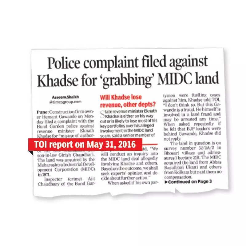 Pune: The FIR registered by the Khadak police naming Digvijay Patil, Sheetal Tejwani, and seven others in an alleged illegal deal of the agriculture department’s land in Bopodi also mentioned the name of Hemant Gawande, who was the complainant in the Bhosari MIDC land deal case involving former revenue minister Eknath Khadse.It mentioned that Gawande was the power of attorney for the land in Bopodi, which govt authorities claimed belonged to the agriculture department. Nayab tehsildar Pravina Borde lodged the complaint.Speaking to TOI, Gawande claimed that the district authorities registered the case in confusion. He said, “Our case is already going on in the court, and I was shocked when I came to know about the FIR. I feel that there is some confusion among govt officials in registering the case. I have told my lawyers to get more details of the case, after which I will give a detailed statement.”Gawande is a developer and was in the limelight when he filed a complaint with the Pune police in 2016 against then revenue minister Eknath Khadse, alleging that he had misused his official powers and helped his family purchase land in Bhosari MIDC at Rs 3.75 crore when the market value was more than Rs 80 crore. Following the police case, Khadse resigned as a minister and faced an inquiry.After the Khadak police named Gawande in the FIR registered on Thursday, Khadse demanded a through investigation against him. Khadse said, “When I was handling the agriculture portfolio as a state minister, the agriculture department officials brought some illegalities to my notice, after which a case was registered against Gawande in Shivajinagar police station in 2016. After that case, Gawande lodged a false case against me and my family members, due to which I had to resign. Now, since another case has been registered against him, the police should investigate in detail and ensure that justice is delivered.”