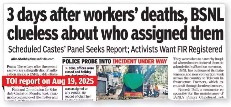 Pune: Police on Wednesday arrested a contractor hired by the BSNL on the charge of culpable homicide not amounting to murder in connection with the Aug 15 deaths of three workers due to alleged suffocation while laying an optical fibre point in a cable duct at Nigdi Pradhikaran.The FIR registered under the Bharatiya Nyaya Sanhita also mentions “an unknown person” among the accused. “Our probe will examine the accountability of any BSNL officials in the matter and we will act against them if found responsible for the deaths,” Nigdi police stations’ senior inspector Mahesh Bansode said.The police action comes after the National Commission for Scheduled Castes on Aug 18 wrote to Pune district collector, Pimpri Chinchwad police, the civic chief and the BSNL chief manager, seeking a report on the matter within three days.Bansode said, “The arrested telecom infra provider (TIP) contractor, Ramesh Patil, was given a contract to replace an optical fibre point for the installation of optical line terminating equipment (OLTE) in the duct. He was aware that the duct was closed for many days. He should have provided safety gear like masks, hand gloves, and gumboots to his workers. Instead, he allowed them to enter the duct without any protection. Moreover, Patil should have arranged for skilled men instead of daily-wage workers for the job.”Based on spot panchanama and statements recorded by four witnesses, including a fourth worker (who survived the incident) and two BSNL junior telecom officers, and a technical analysis of call data records of the workers and others, police prima facie fixed Patil’s responsibility, the police officer said. Lakhan Dhavare (32) and Sahebrao Girset (36) from Bijlinagar, and Datta Vhanale (38) from Gurudwara Colony — all areas in Pimpri Chinchwad — died of alleged suffocation after they entered the BSNL duct for an optical fibre point work. Doctors at Yashwantrao Chavan Memorial Hospital stated in the post-mortem reports: “Viscera has been preserved. Opinion as to the cause of death is reserved till report of chemical analysis is made available.”Assistant inspector Shriram Shinde of the Nigdi police told TOI: “Patil had been undertaking BSNL work since Oct 2022. Deceased Vhanale was working with him on a commission basis. His job was to get orders for new optical fibre connections from the BSNL for Patil.”A senior BSNL officer, who did not wish to be named, said, “Patil was working with TIP to which the BSNL has outsourced the installation of new connections and maintenance. He received a request for fresh connections in a nearby housing society. He attempted to link the OLTE to the distribution network without following the prescribed protocol.”As per the standard operating procedure, vendors must raise a request with the BSNL for approval to connect OLTE, the officer said. “Permission is granted only after a feasibility inspection and paperwork. Post-approval, the OLTE must be connected in the presence of BSNL staff. On Aug 15, there was no official request to connect OLTE. All vendors and our staff were on I-Day leave. There was no complaint either of any fault nor any maintenance was planned,” the BSNL officer said.