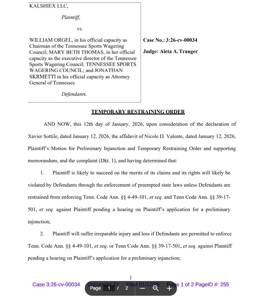 In the order issued January 12, Judge Aleta Trauger of the US District Court for the Middle District of Tennessee found that Kalshi would likely face irreparable harm if Tennessee enforced its sports wagering and gambling statutes against the company.