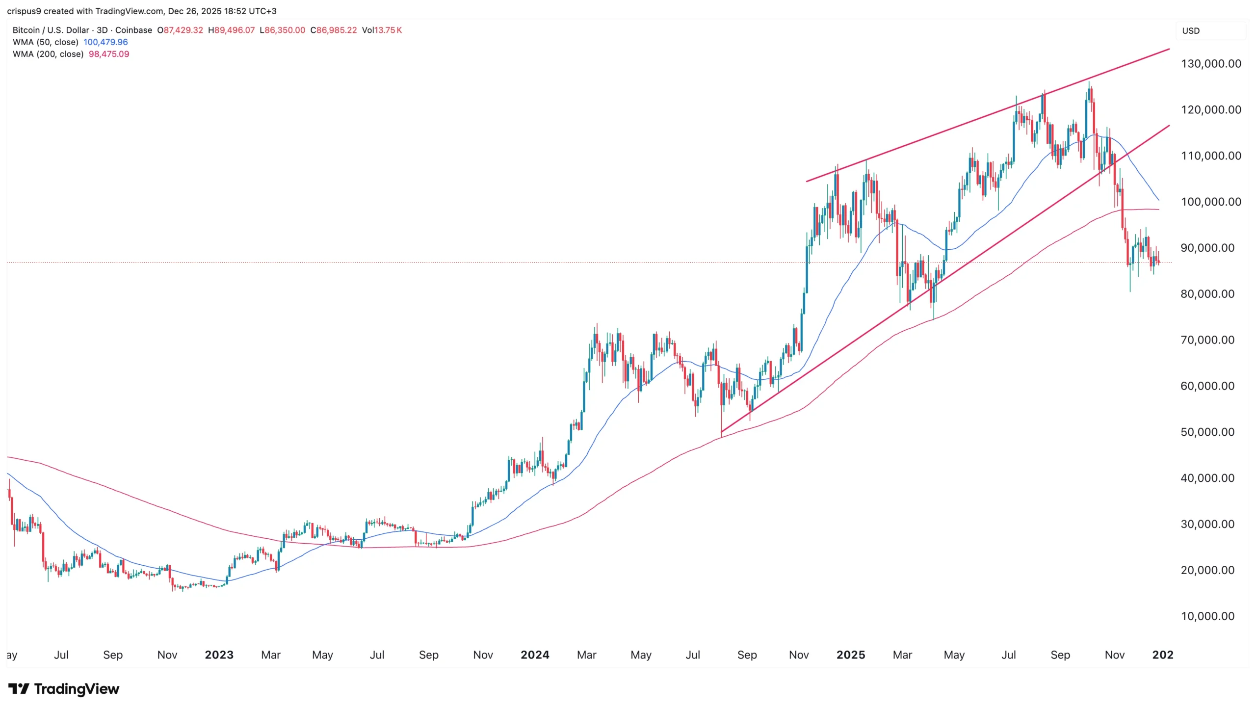 The three-day chart shows that Bitcoin price remains under pressure and has formed numerous bearish patterns that may lead to more downside in the near term.