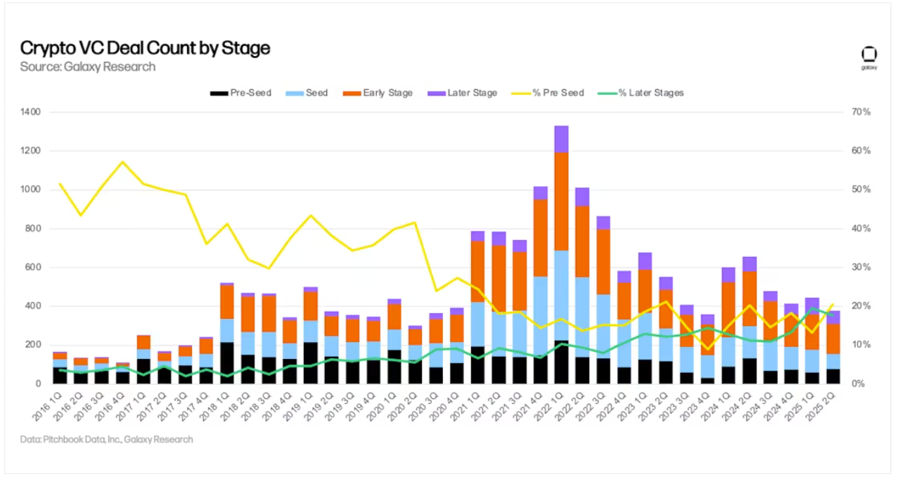 Crypto venture deal activity has continued to weaken in 2025, according to the latest available data, with both funding volumes and deal counts trending downward. Source: Galaxy Research