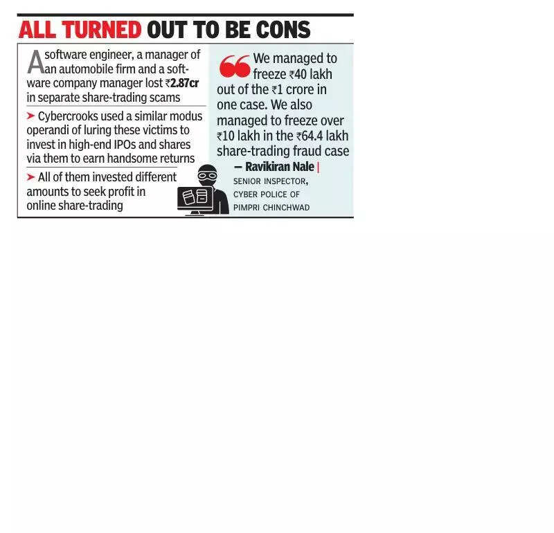 Pune: Cybercrooks duped three people of Rs 2.87 crore in online separate share-trading scams.A software engineer (42) of Bavdhan lodged a complaint with the Bavdhan police on Friday, stating that online fraudsters cheated him of Rs 1.23 crore between Dec 2025 and Jan by promising him over 500% returns.According to Bavdhan police, the victim’s cellphone number was added to a group on a messaging application where the fraudsters always discussed good returns earned by trading shares online. The group members always thanked the group admin for his tips on share trading.The victim, who was lured by these messages, contacted the group admin. The group admin promised him 500% returns on his investment in the trade of online shares. The fraudsters then sent him a link to a share trading application. The victim downloaded the application.The victim started trading shares of lesser value. The group admin then contacted the software engineer, asking him to invest in the high-value shares and IPOs. The victim agreed. The fraudster promised to help him in buying the high-value shares and IPOs.The fraudster then shared 6 different bank accounts with the victim and asked him to transfer money to the bank accounts so that the suspect could buy high-value shares for the victim, police said.Police said the victim then transferred money. The application, within a few days, showed a profit of over Rs 1 crore. When the victim decided to sell the shares for profit, the fraudsters kept asking for more money to allow him. The victim then realised that he was cheated.Similarly, a manager of an automobile company from Chinchwad lodged a complaint with the Pimpri-Chinchwad’s cyber police, stating that online scamsters cheated him of Rs 64.4 lakh by promising him handsome returns on his investment in the trade of online shares.Additionally, manager with a software company, a resident of Wakad, lodged a complaint with the cyber police, stating that the online fraudsters cheated him of Rs 1 crore by promising him handsome returns.Senior inspector Ravikiran Nale of the Pimpri Chinchwad’s cyber police station told TOI “We managed to freeze Rs 40 lakh out of the Rs 1 crore. We also managed to freeze over Rs 10 lakh in the Rs 64.4 lakh share-trading fraud case,” Nale said.