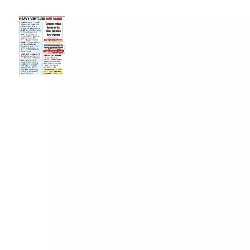 Pune: A 20-year-old college student, riding pillion on her father’s scooter, was run over by a dumper after she fell as their two-wheeler wobbled over an uneven drainage chamber near Kolte Patil society in Punawale, close to Hinjewadi, around 1.35pm on Monday.Police identified the deceased college student as Tanvi Sakhare. She came under the rear wheels of the heavy vehicle following the fall. Her father, Siddheshwar Sakhare, fell on the opposite side and escaped with minor injuries, the police said.Senior inspector Balaji Pandhare of the Hinjewadi police said, “The two were returning to their Hinjewadi home after Siddheshwar picked up his daughter from a private tuition class. On the way, they purchased vegetables from a market. Their scooter hit the uneven drainage chamber and wobbled when they reached Kolte-Patil society. As a result, her father lost control over the two-wheeler and they fell on the road. Tanvi came under the rear wheel of the dumper, running parallel to the scooter.”Tanvi died on the spot. “The dumper driver ran away abandoning the heavy vehicle on the spot. We traced and took him into custody. A case of causing death due to negligence is being registered against the driver,” Pandhare said.There have been multiple accidents in and near Hinjewadi involving heavy vehicles. But Monday’s accident, Pandhare said, did not occur during the timings when heavy vehicles were banned in the area.An officer from the Pimpri Chinchwad traffic branch said heavy vehicles were prohibited from entering the areas under the Pimpri Chinchwad police commissionerate from 8am to 12noon and from 5pm to 10pm every day. “We have been constantly taking action against the heavy vehicles flouting the norms under sections 281 (rash driving on public way) and 285 (danger or obstruction in public way or line of navigation) of the BNS,” the officer said.A dumper ran over a 13-year-old girl near Infosys Circle in Hinjewadi on Aug 12 when she was going to book a Ganapati idol with her mother. A ready-mix concrete (RMC) truck ran over a beautician (34) on Hinjewadi-Maan road on Oct 10 morning, when heavy vehicles are prohibited from plying in the area.Residents of the area and IT employees have been constantly demanding action against the movement of heavy vehicles beyond their permissible time limit in the area. People held protests expressing concerns over the increasing number of fatalities because of heavy vehicles and poor road condition in the area.