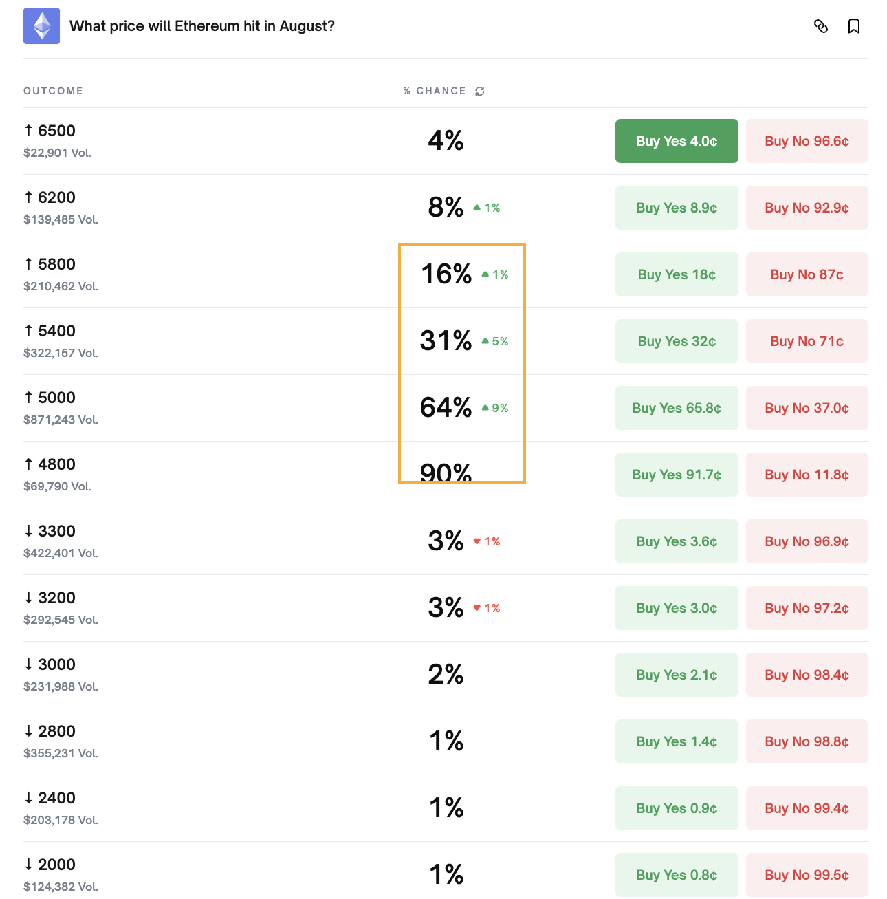 Ether trades at $4,600 with a 64% chance of hitting $5,000 by Aug. 31.
