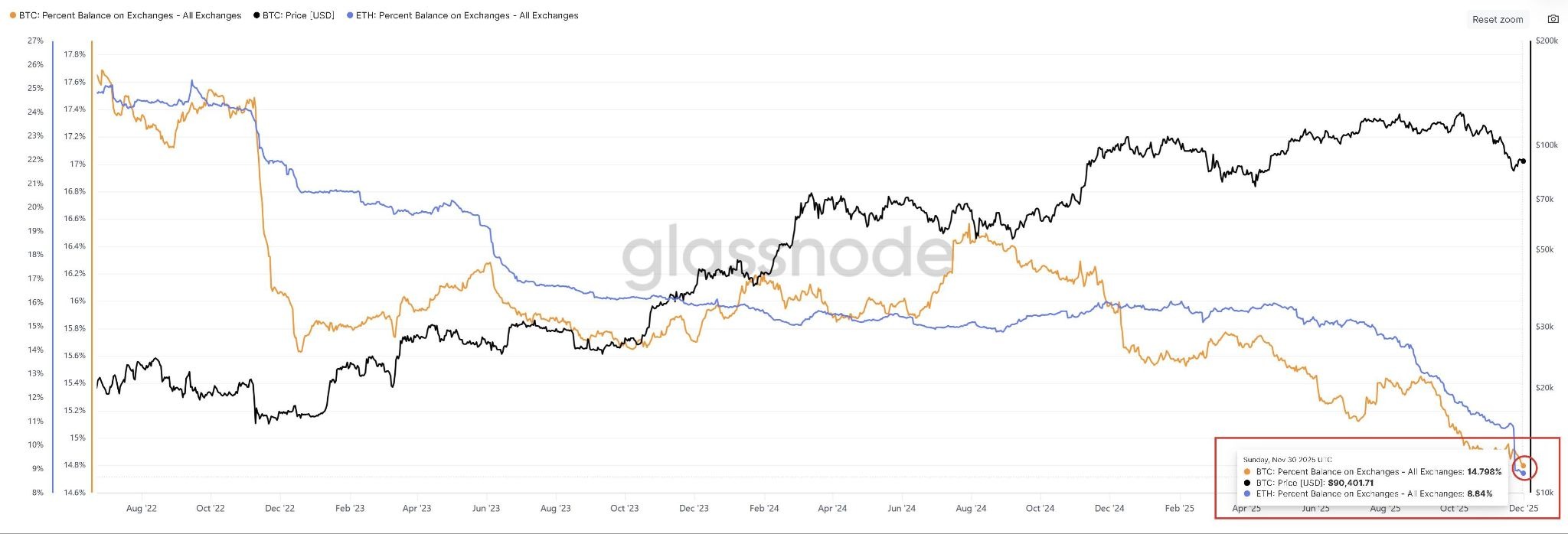 BTC vs ETH stored on exchanges. Source: Glassnode