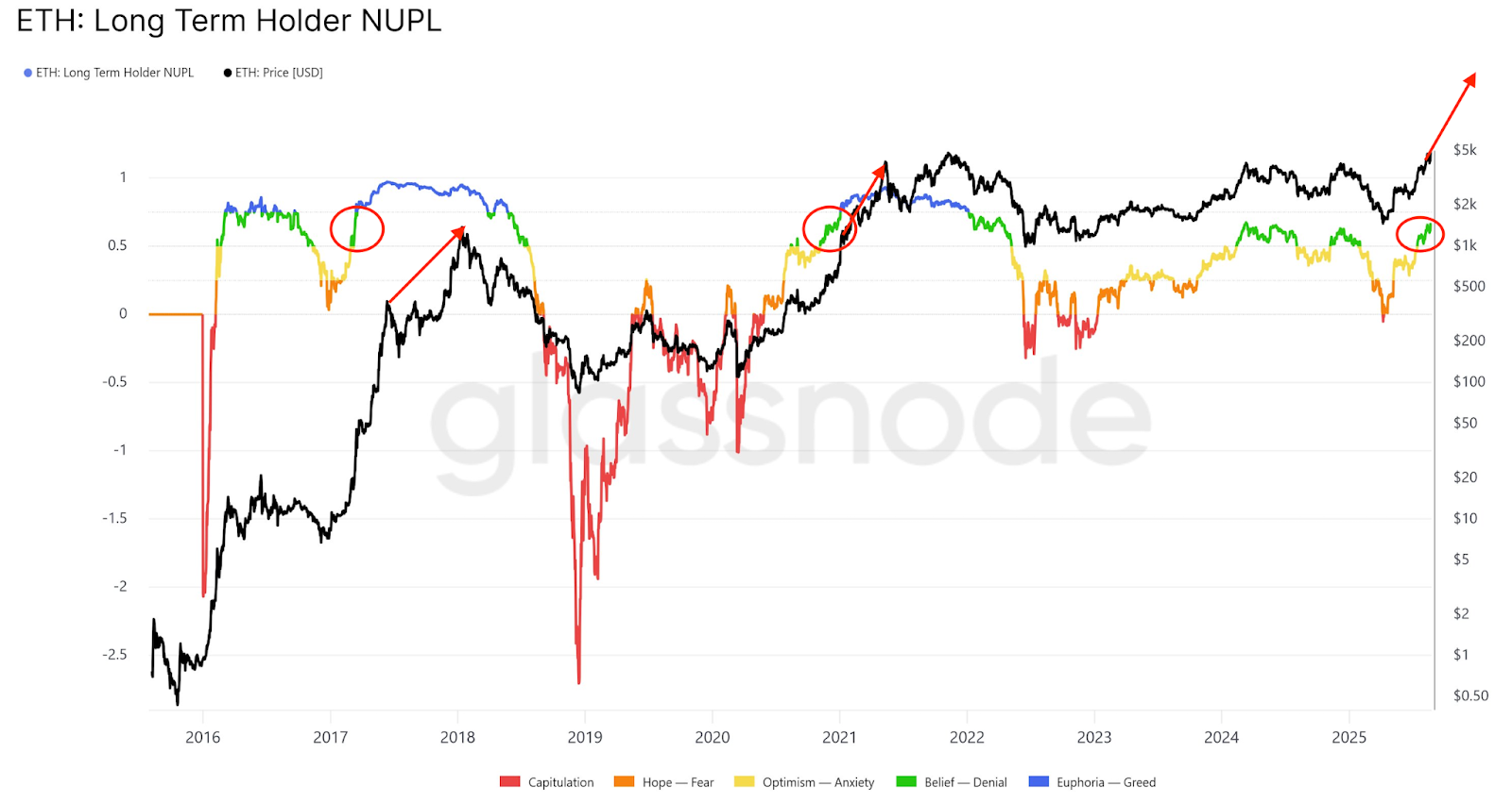 Ether’s long-term holder (LTH) net unrealized profit/loss (NUPL) indicator has entered the “belief-denial” (green) zone, a position that historically precedes significant price rallies, said popular analyst Gert van Lagen in an X post on Monday.