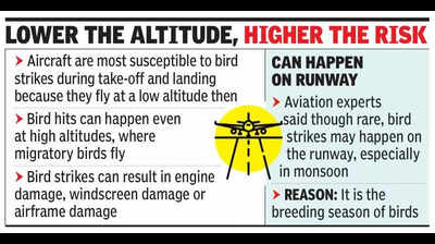 Pune: Aviation experts hinted at faults in precautionary steps to keep flying creatures at bay from the city airport, after an Air India Express flight to Bhubaneswar aborted take-off because of a bird strike while rolling on the runway.Aviation experts and ornithologists said though rare, bird strikes may happen on the runway, especially in monsoon. Reason: It is the breeding season of birds. “Maximum bird hits are reported in the rainy season,” said Deepak Shastri, an aviation expert and former director of the Pune airport“Airport authorities use LPG-operated and pre-timed zone guns. Loud sound from these every two-three minutes startles birds and they fly away from the runway area. These guns are generally kept on either end of the runway and rotate at a 360-degree angle. I feel Wednesday’s incident might have happened because of a fault in these. There is a chance that the gun or guns were not functioning,” Shastri told TOI.There were 140 passengers on the bird-struck Airbus A350 on Wednesday. The aircraft came to a screeching halt on the runway after its pilot slammed sudden brakes. The Indian Air Force manages the runway and the air traffic control of the Pune airport.Shastri said, “They (IAF) might be in charge of the runway, but the AAI (Airports Authority of India) can always inspect the arrangements. If any gaps are visible, the AAI should alert the IAF. It has to be a collective effort,” he said.Haphazard dumping of garbage near the airport are often cited as reasons behind bird strikes. Minister of state for civil aviation and Pune MP Murlidhar Mohol said the Pune Municipal Corporation (PMC) was working on a garbage management plan.“It will take some time for the difference to be seen. I am aware of Wednesday’s incident, and I shall talk to the PMC commissioner,” he said.Ornithologist Satish Pande, the founder of Ela Foundation, said, “Whether the airport authorities have an ornithologist on board to deal with such (bird strike) cases or not is not clear. Studying birds is an extremely specialised business, but people don’t take it seriously. The entire physiology of how birds see aviation and how such incidents can be avoided are very technical subjects and need expertise. I think the airport authorities are not considering these.“Pune airport director Santosh Dhoke said, “The coordination has been good between the AAI, IAF and the PMC. All stakeholders are working sincerely towards controlling the same (bird strikes),” he said.Pilots said probabilities coming out of a bird strike could be in hundreds. “Even if an engine is lost, aircraft are capable of continuing with take-off and climb. But what can happen is a difficult question to answer,” said Captain Arpit Manshani, a pilot.