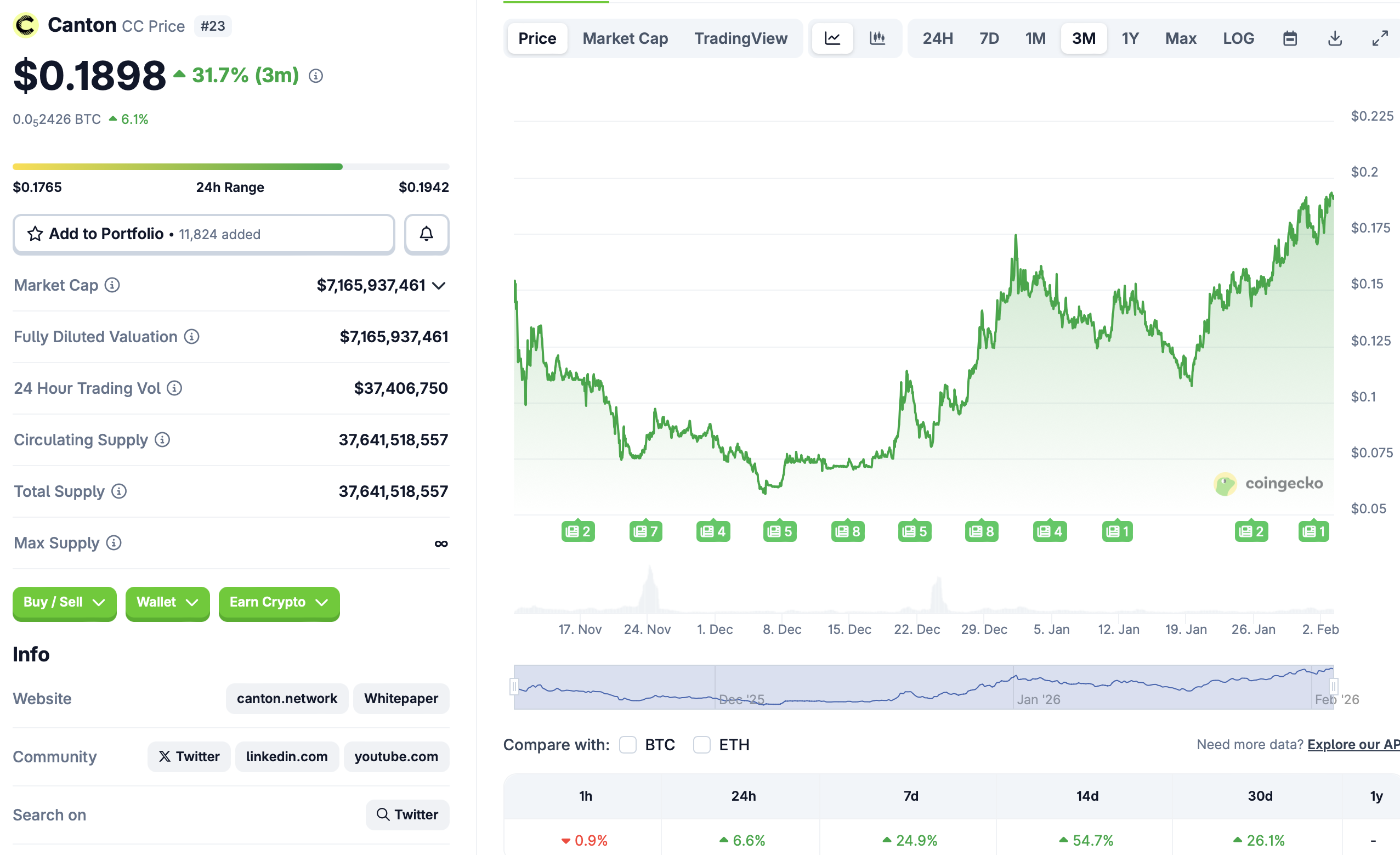 Canton’s native token, Canton Coin, has responded to increased network activity. It is up about 31% over the past three months, according to CoinGecko data.