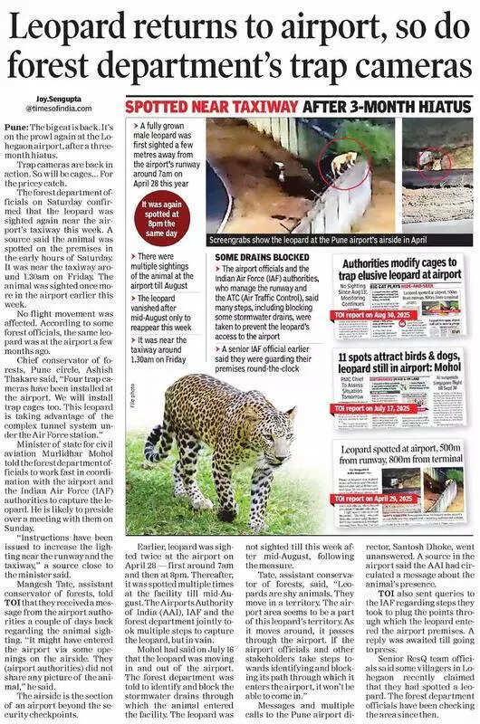 Pune: Forest department officials on Sunday said a change in strategy — including the use of tranquiliser guns — is expected to capture the leopard spotted again at the city airport, particularly if it is deemed that the big cat has become ‘static’ and started living there. Officials said that the leopard, seen twice at the airport this week, appears to be the same fully grown male first sighted near the runway on April 28 this year, and thereafter multiple times in the vicinity till Aug 13. “Last time, the leopard started living near Pune Air Force Station. This is a smart animal, as it did not get into any of the cages we had set out previously, despite modifying some of them to appear like stormwater drain entrances. This time, we will need to change our strategy and do anything to capture it if it becomes static in the airport area and tries to come on or near the runway,” assistant conservator of forests, Pune, Mangesh Tate told TOI on Sunday. Forest officials said that as of now, five trap cameras have been installed, and they are identifying spots from where the big cat might be entering the airport. No cages have been set up yet. “Once the spots are properly identified, we plan to install more cameras and trap cages, too. Night patrol teams are also deployed. Last time as well we had planned to tranquilise the animal, but it stopped coming to the airport and disappeared before that could be done,” Tate said, Another official said the trap cages, which were earlier set up outside the airport area, had been removed since. He added, “The trap cages were removed as the leopard is just not entering them. Pune airport is just one part of this big cat’s territory. While we are working towards tracking it, several AI-generated photos are circulating. This is confusing us as well as residents. As of now, the leopard is not a threat.” Airport staff on alert Meanwhile, ground staff working at Pune airport have been asked to remain alert and take safety precautions when they move and work on the airside, another forest official said. Airport sources said instructions have been sent to staff via airlines as well as other stakeholders to be alert and not venture towards the airside alone. “There is nothing to worry about, but some precautions are being taken. The ground staff works all the time in the apron area. They have been asked to move in groups of two and three or more,” an airport official said.