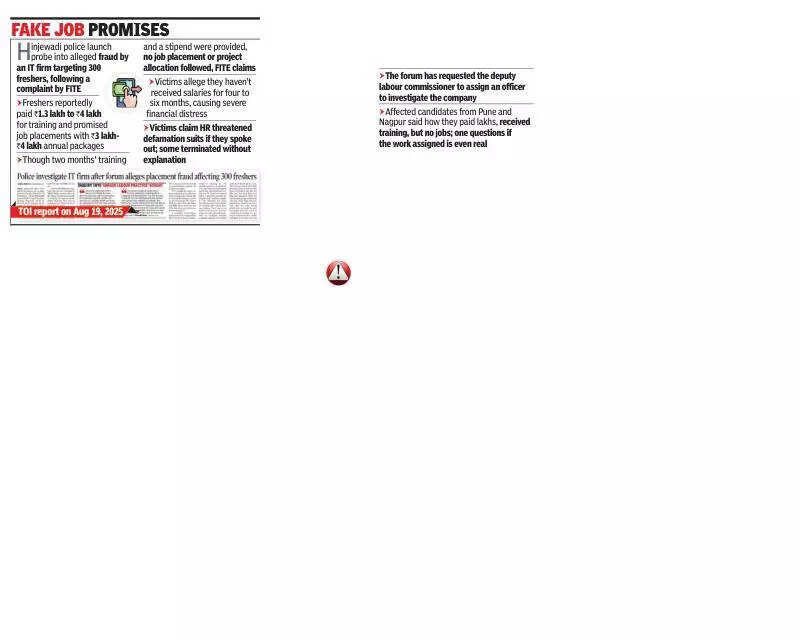 Pune: The founder of an IT company in Hinjewadi was arrested on Saturday while a case was registered against the director by the Hinjewadi police on the charge of duping at least 300 freshers under the pretext of training and placement with the firm.The establishment had appointed over 300 IT freshers through different consultancy firms between Dec 2024 and July, and taken between Rs1lakh to 3 lakh from them for training and placement. The company provided online training for two to three months and paid a stipend too. Later, the training stopped and the company shut down.Some of the freshers approached the Forum for IT Employees (FITE), Maharashtra, last week. In turn, FITE went to the police with them. After investigations, the Hinjewadi police on Saturday night registered a case under sections 316 (criminal breach of trust) and 318 (cheating) against the company’s founder and the director.Inspector Hrushikesh Ghadage of the Hinjewadi police is investigating the case. He told TOI: “The company’s founder, Upesh Patil (37) of Hinjewadi, had switched off his cellphone. His two offices were locked. We traced Patil to Dehu Road on Saturday night and took him into custody.”Ghadage said a 24-year-old IT fresher of Kalewadi, also affected by the fraud, lodged a complaint in this regard.“So far, we have received complaint applications from at least 15 victims duped of Rs17.2 lakh. Prima facie investigations revealed that over 300 freshers were conned by the company,” he said.The officer said that according to the complainant, the company’s founder, general manager and HR director took informative sessions on campuses of different colleges. They would send emails to the freshers through the consultancy firms and inform them about the job profile. “The firm’s officials selected the candidates after online interviews,” he said.Ghadage said the company sent appointment letters to the selected candidates and demanded Rs1 lakh to Rs2.5 lakh for the placement. “The freshers received joining letters after transferring money to the company’s bank account. The firm gave them online training for two to three months, and some of the candidates were paid stipends of Rs15,000 to Rs20,000,” he said.The officer said that a few days later, the company organised an internal job posting exam and terminated most of the candidates by claiming they had failed the test. “The number of freshers who were duped is large. Our investigations are going on,” Ghadage added.