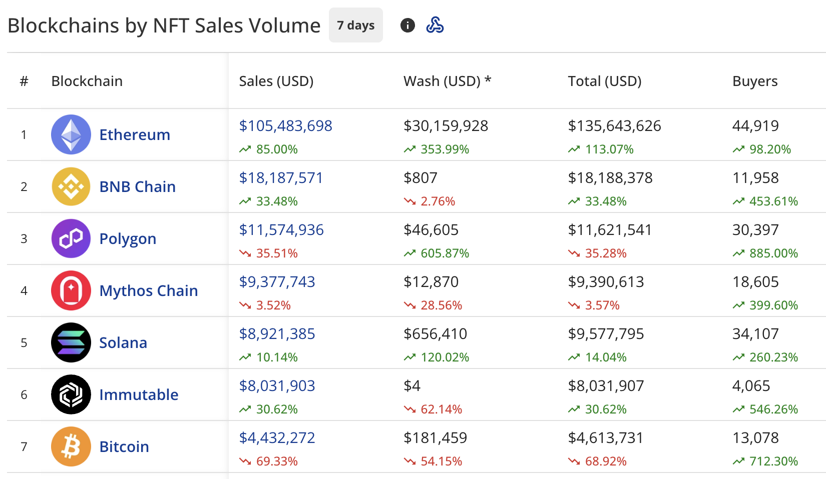The buyer count has increased across most blockchains, with Polygon leading at 885% growth, followed by Bitcoin at 712.30% and Immutable at 546.26%.