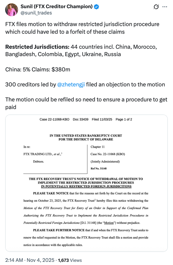 On Monday, the FTX Recovery Trust filed a notice withdrawing its request to implement special procedures for jurisdictions such as China, which had been flagged as potentially restricted under the confirmed bankruptcy plan.