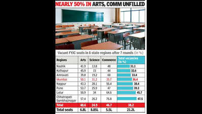 Mumbai: Science remains the most sought-after stream for first-year junior college (FYJC) aspirants, not only in Mumbai but across the state, with only around 25% of seats vacant after seven rounds of admissions. On the contrary, nearly 50% of seats remain vacant in both arts and commerce streams (see box).In regions such as Mumbai, Pune and Kolhapur, vacancies in arts exceed those in commerce, whereas in Nashik, Amravati, Nagpur, Latur and Chhatrapati Sambhajinagar, commerce has a higher percentage of vacant seats. Overall, among the eight administrative regions for the department, Nashik has the lowest percentage of vacant seats, followed by Kolhapur and Amravati, whereas Chhatrapati Sambhajinagar and Latur have close to 50% vacancies, the highest. In commerce, despite having the highest seats (2.3 lakh), Mumbai had the lowest vacancies in the state, indicating a huge demand. Of the total FYJC seats in Mumbai, more than one in three are vacant after seven rounds.With over 21 lakh seats available for FYJC admissions and only around 14.7 lakh aspirants, a significant number of seats is expected to remain vacant across the state. However, state-wide data from the school education department, available for the first time, shows a notable pattern in student preferences in junior colleges. FYJC admissions were conducted online for the first time in the state. Till last year, e-admissions were done only in five municipal areas of MMRDA, Pune, Pimpri-Chinchwad, Amravati, Nagpur and Nashik. They were also conducted independently by regional offices. This year, it is conducted centrally by directorate of secondary and higher secondary education.Vacancies in FYJC could be rising over the years owing to the increase in unaided seats, said Karuna Gokarn, principal, St Xavier’s College. She said students’ primary focus post their school could be on engineering and medical, contributing to the higher number of aspirants. This year though, she added, their FYJC science cutoff is almost at par with arts, when usually they are marginally lower.Mahesh Palkar, director, secondary and higher secondary education, said of the total applicants, only 13.44 lakh have filled their preferences, and so far 13.11 lakh of them have secured admissions. There is a possibility the remaining one lakh plus students have gone for polytechnic or ITI courses, he added. “Though we have not done an analysis of the data to see the trend of courses among students, science is the most popular in the state. In cities like Mumbai, a majority of students are opting for commerce, followed by science and in Pune, over 50% who have secured admissions are in science,” said Palkar.Krutika Desai, principal, Mithibai College, said a majority of students are still exposed to opportunities in engineering and medical at school level and that is where aspirations lie. “Once they fail to secure medical or engineering seats, they look at other options after Class 12 and that is when the demand drops for science. Even in sciences, no one talks about the research options, or even in arts, no one is looking beyond psychology and economics,” she said.Palkar said if students are still left without admissions after the seventh round, they may conduct one more round.