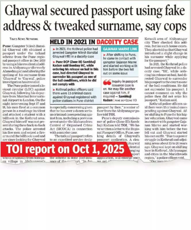 Pune: Gangster Nilesh Ghaywal changed his address on Aadhaar card before applying for a passport in 2019, deputy commissioner of police (Zone III) Sambhaji Kadam said on Saturday. The revelation came amid an ongoing investigation into how Ghaywal managed to obtain a passport from Ahilyanagar despite having multiple criminal cases against him.“Ghaywal, who faces 13 criminal cases, previously had an Aadhaar card showing his address in Kothrud. We suspect the change (in address) was made to help him obtain a passport despite his extensive criminal background. His wife and son hold passports that still reflect the Kothrud address,” Kadam said.Pune police issued a lookout circular (LOC) against Ghaywal, who managed to flee the country and reach London despite facing multiple criminal charges. The LOC was triggered following two violent incidents in Pune’s Kothrud area on the night of Sept 17. In the first incident, Ghaywal’s associates allegedly opened fire on a local resident in a road rage altercation. Shortly after, they attacked a 19-year-old student with a sharp weapon. Although Ghaywal was not physically present during these attacks, police arrested five of his gang members and recovered the firearm and billhook used in the crimes.“Our teams spent two days in Ahilyanagar district gathering documents submitted by Ghaywal to the passport office under the tatkaal scheme,” Kadam said, adding, “Upon reviewing these documents, we discovered the address change on his Aadhaar card. What’s more surprising is the discrepancy in the spelling of his surname. While police and other official records use ‘Ghaywal’, his Aadhaar card, birth certificate and other documents show it as ‘Gaiwal.‘ We are now investigating how this alteration occurred.”Police investigations have so far revealed that Ghaywal secured a passport in Dec 2019 from the Pune regional passport office under the tatkaal scheme by submitting a bogus residential address proof of Ahilyanagar (formerly Ahmednagar) and making a change in his surname from Ghaywal to Gaiwal.On Friday, a video was circulated on different social media platforms, in which a money lender from Dharashiv claimed that he received a threat call from Ghaywal, threatening him using the name of a state minister. “It is an old video. We do not know if the money lender has registered any complaint with the Dharashiv police,” Kadam said. “After completing our investigations, we may approach the passport office seeking cancellation of his passport,” the officer added.