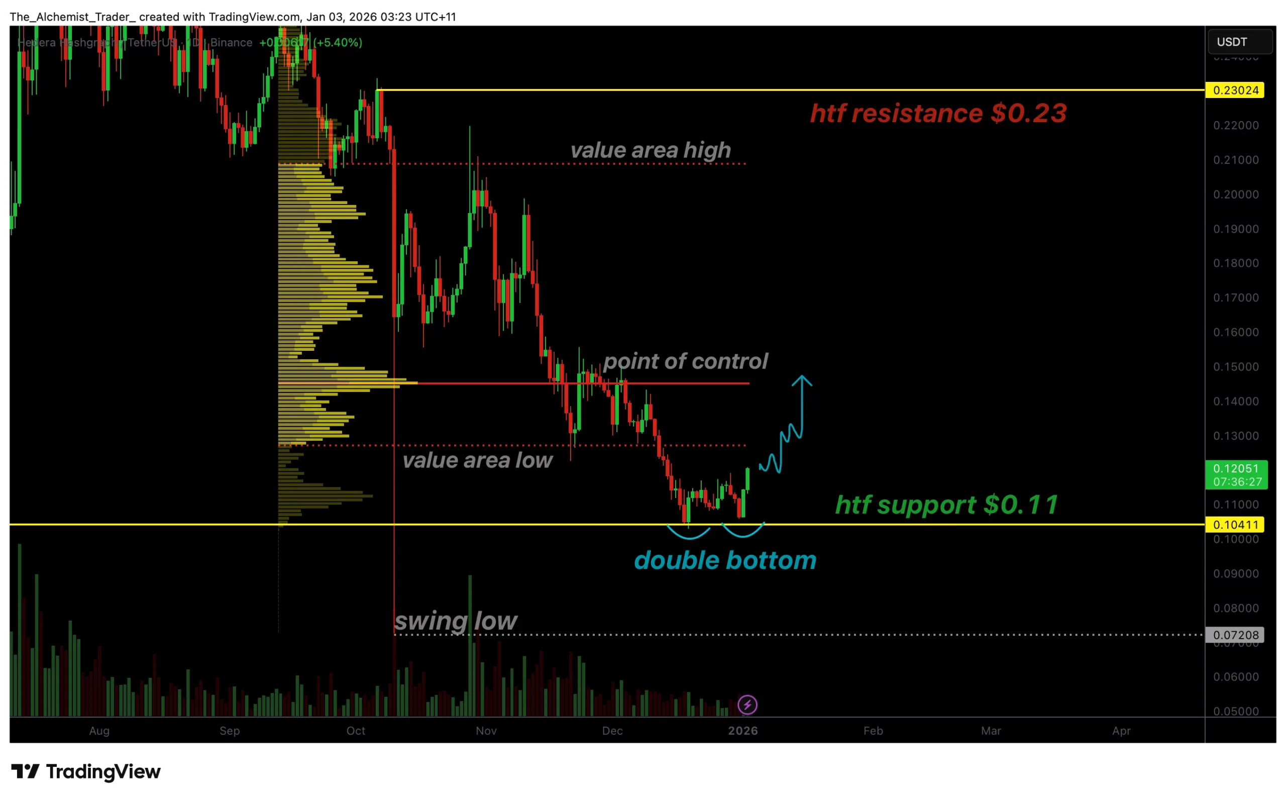Following the formation of the double bottom, HBAR has rallied into the value-area low, which represents the next major volume-based resistance level. This level often acts as a decision point, determining whether a move is merely a short-term relief bounce or the start of a larger trend change.