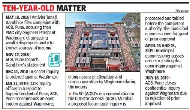 Pune: The Bombay high court has quashed and set aside Pune municipal commissioner’s orders of April 16 and 25, 2019, that rejected an open inquiry by the state anti-corruption bureau (ACB) against former city engineer Prashant Waghmare on the allegations of amassing assets disproportionate to his known sources of income.The bench of Justice AS Gadkari and Justice Ranjitsinha Raja Bhonsale held on April 2 that a prior approval for an open inquiry in a disproportionate assets (DA) case was not required and the PMC chief, as the Competent Authority for the grant of prior approval, exceeded his jurisdiction by holding a hearing and getting into details of the matter to turn down the approval plea.The bench, while allowing the petitioner’s prayer for an open inquiry against Waghmare, said, “After conducting the open inquiry the authorities will follow the procedure and process as envisaged in the Prevention of Corruption Act and take swift and appropriate action in accordance with law.” The ACB will have to approach the competent authority again for a sanction to prosecute in the event of the open inquiry establishing any prosecutable evidence against Waghmare.Later, at the request of the PMC’s lawyer, the bench granted a two-week stay on its ruling to enable the civic administration to move an appeal before the Supreme Court.“We will be filing an appeal in SC considering the state-wide ramification of the HC judgment vis-à-vis multiple pleas by third party individuals seeking DA case inquiries and using the same as a tool to harass or put pressure on govt officials. Also, the PMC chief’s impugned orders were in line with the Govt Resolution of March 3, 2015, that empowers a competent authority to hold an inquiry before granting or rejecting prior approval,” advocate Abhijit Kulkarni, who represented the PMC, told TOI.Activist Tanaji Gambhire had filed a petition before the HC in 2021 alleging that PMC was protecting Waghmare, who has amassed wealth worth multiple crores of rupees disproportionate to his known sources of income.The bench held, “The competent authority under section 17(A) of the PC Act, is required to verify if, the collected material, merits an enquiry or inquiry or investigation and the same can be done only when the alleged offences are ‘offences relatable to recommendations made or decision taken by public servant in discharge of official functions or duties’ and not otherwise.. Further, even if the offences are relatable to recommendations made or decision taken by public servant in discharge of official functions or duties, the competent authority has no power and/or authority under section 17(A) of the PC Act, to conduct an hearing, investigation or get into the merits of the matter and undertake a detailed enquiry and/or conduct a mini trial.“The role of the competent authority is to see and consider whether the preliminary material as collected by the enquiry officer makes out a prima facie case. The competent authority has no authority to usurp the powers of the authorized Inquiry Officer under section 17 of the PC Act or the power to grant or refuse sanction to prosecute under section 19 of the PC Act, the bench said.Ten-year-old matter# May 18, 2016: Activist Tanaji Gambhire files complaint with ACB, Pune, accusing then PMC city engineer Prashant Waghmare of amassing wealth disproportionate to known sources of income# Nov 12, 2018: ACB, Pune records Gambhire’s statement# Dec 11, 2018: A secret inquiry is ordered against Waghmare# Jan 31, 2019: ACB inquiry officer in a report to Superintendent of Pune, ACB, Pune recommends an open inquiry against Waghmare, citing nature of allegation and non-cooperation by Waghmare during the inquiry# On SP (ACB)’s recommendation to the Director General (ACB), Mumbai, a proposal for an open inquiry is processed and tabled before the competent authority, the municipal commissioner, for grant of prior approval# April 16 and 25, 2019: Municipal commissioner passes orders rejecting the open inquiry against Waghmare# July 18, 2019: ACB, Pune closes confidential inquiry against Waghmare due to rejection of prior approval