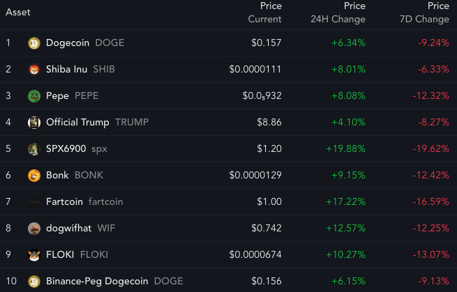 Top 10 memecoins by market cap, with daily and weekly price change