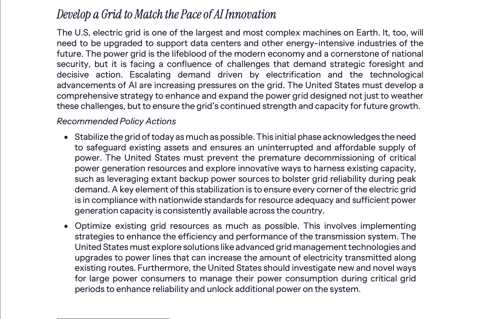 Reccomended policy actions to overhaul US energy infrastructure for AI needs. Source: The White House